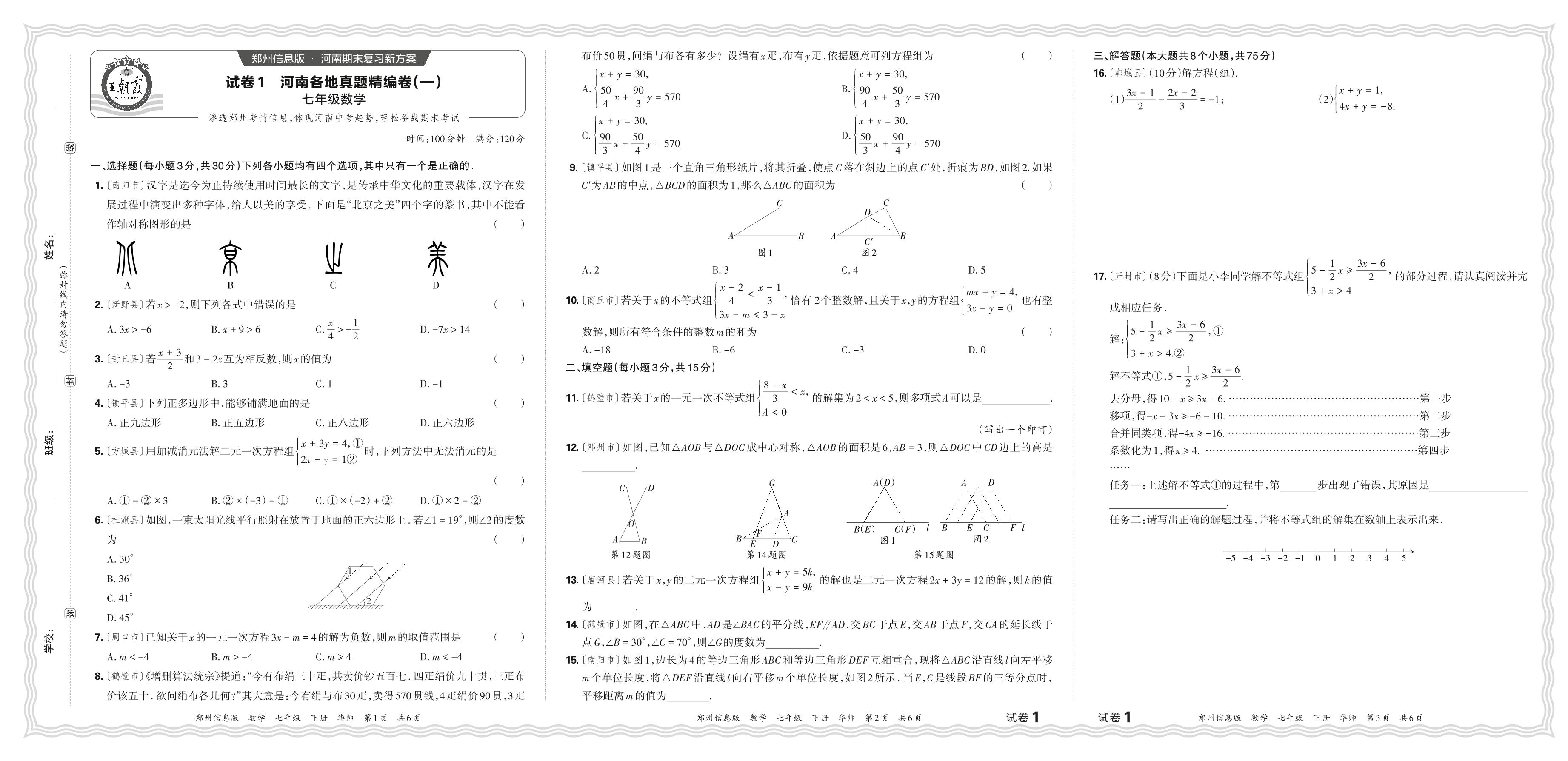 2024年春河南各地真题精编(一)七年级下册期末数学(华师版)【1】