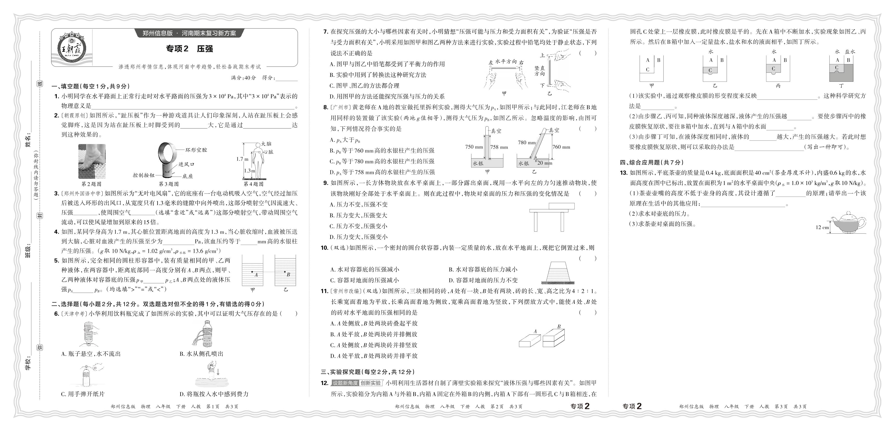 2024春下册八年级物理人教版 期末专项卷郑州版·压强【2】