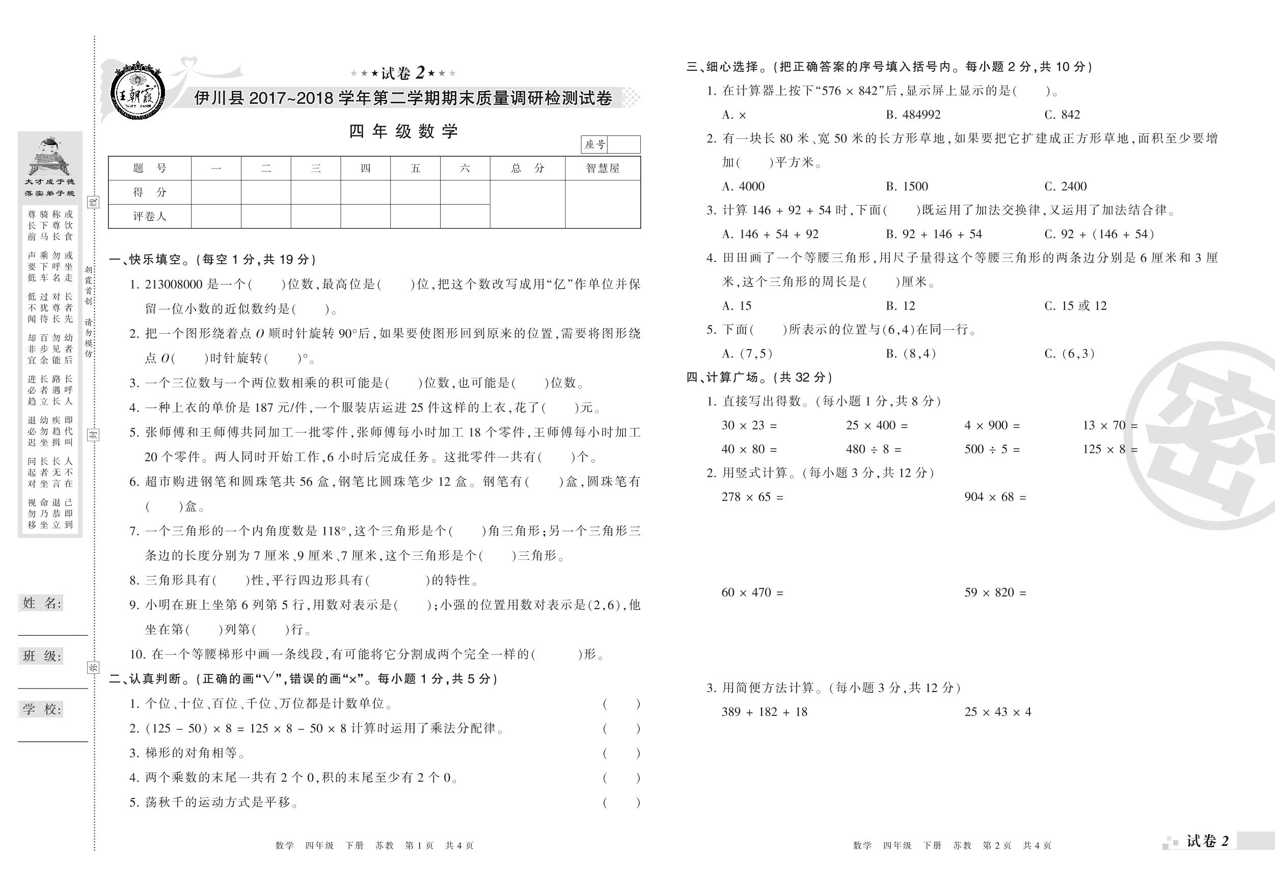 2017-2018学年第二学期洛阳市伊川县四年级数学试卷(苏教版)【2】