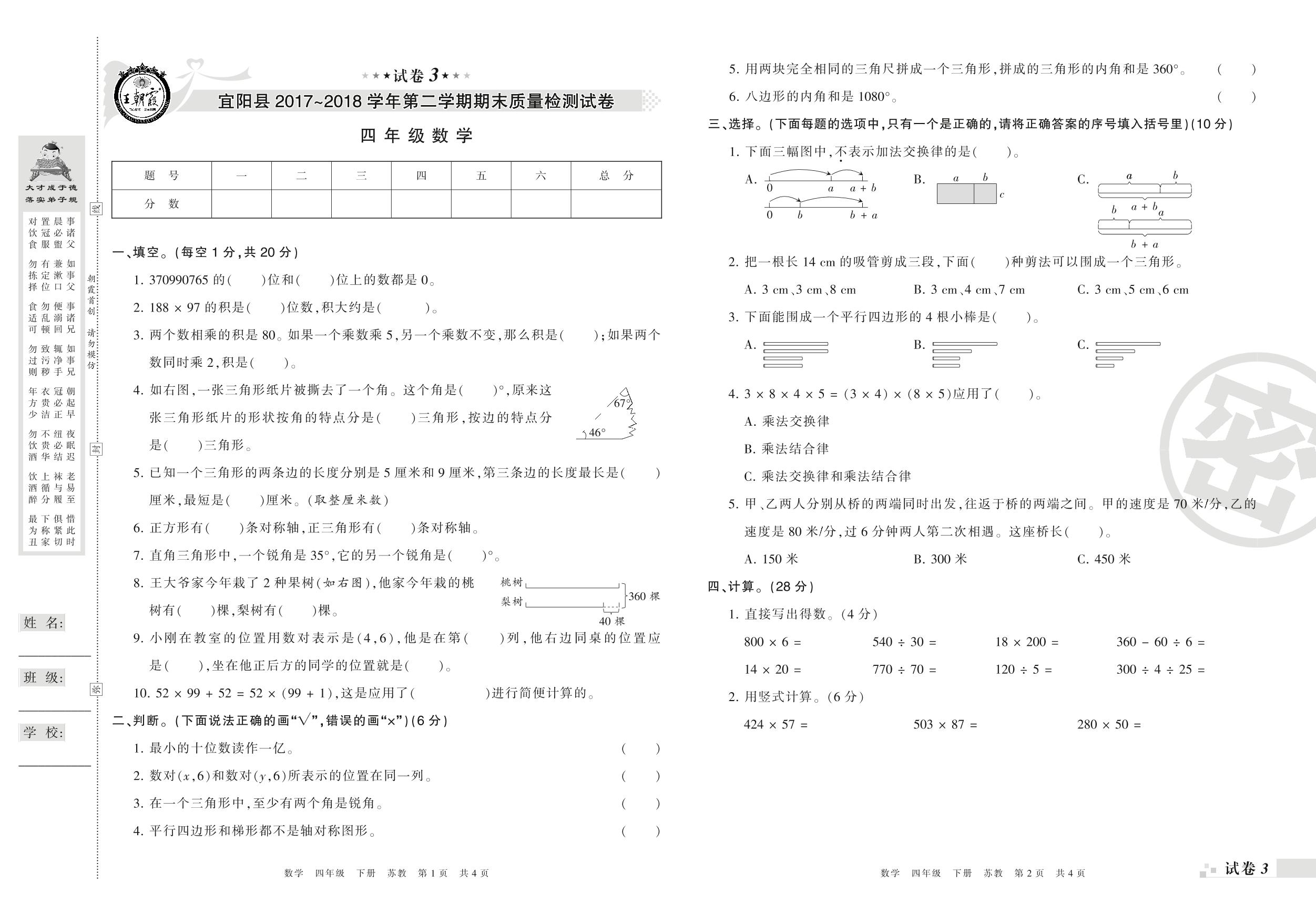 2017-2018学年第二学期洛阳市宜阳县四年级数学试卷(苏教版)【3】