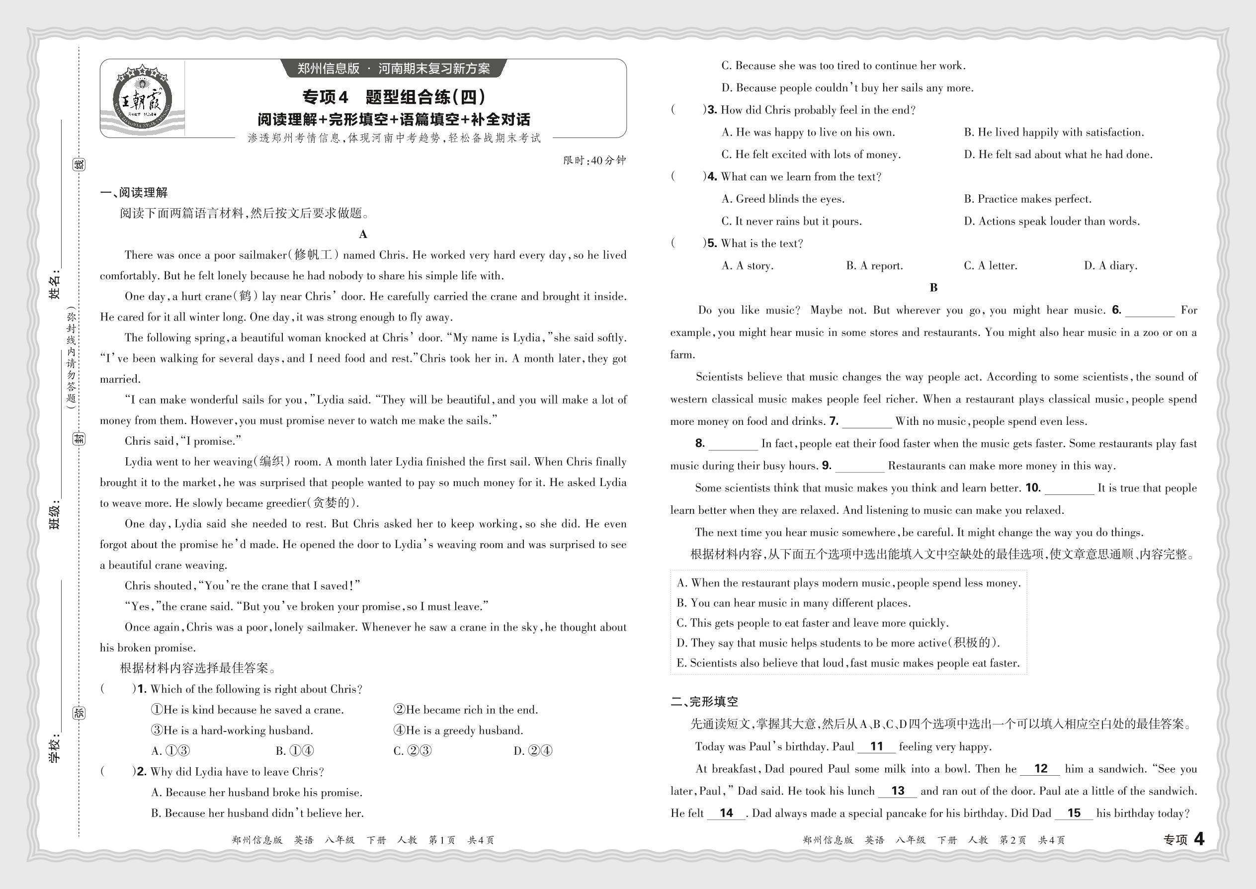 2024春下册八年级英语人教版 期末专项卷郑州版·题型组合练(四)
