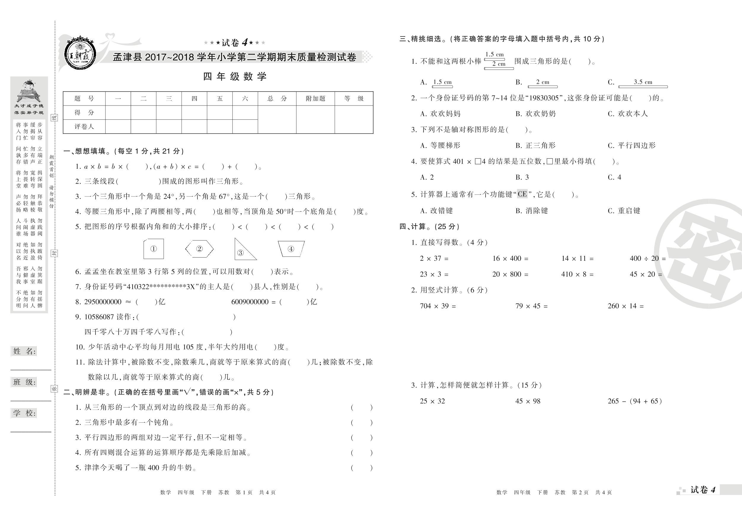 2017-2018学年第二学期洛阳市孟津县四年级数学试卷(苏教版)【4】
