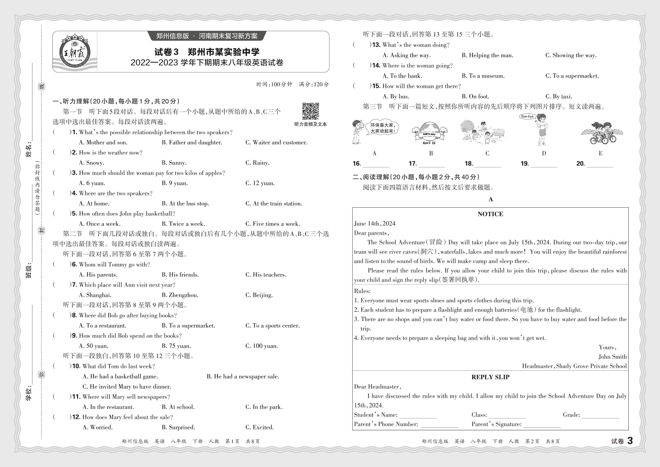 河南省郑州市某实验中学2022-2023学年下期期末八年级英语试卷(人教版)【3】
