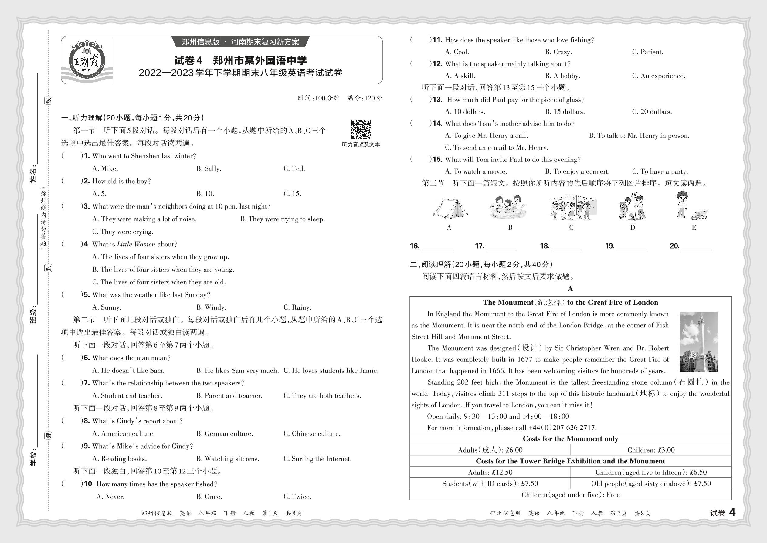 河南省郑州市某外国语中学2022-2023学年下学期期末八年级英语考试试卷(人教版)【4】