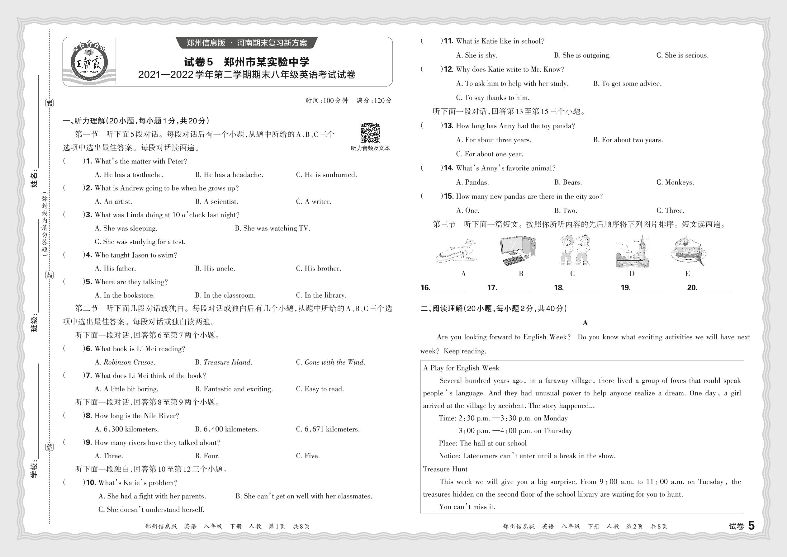 河南省郑州市某实验中学2021-2022学年第二学期期末八年级英语考试试卷(人教版)【5】