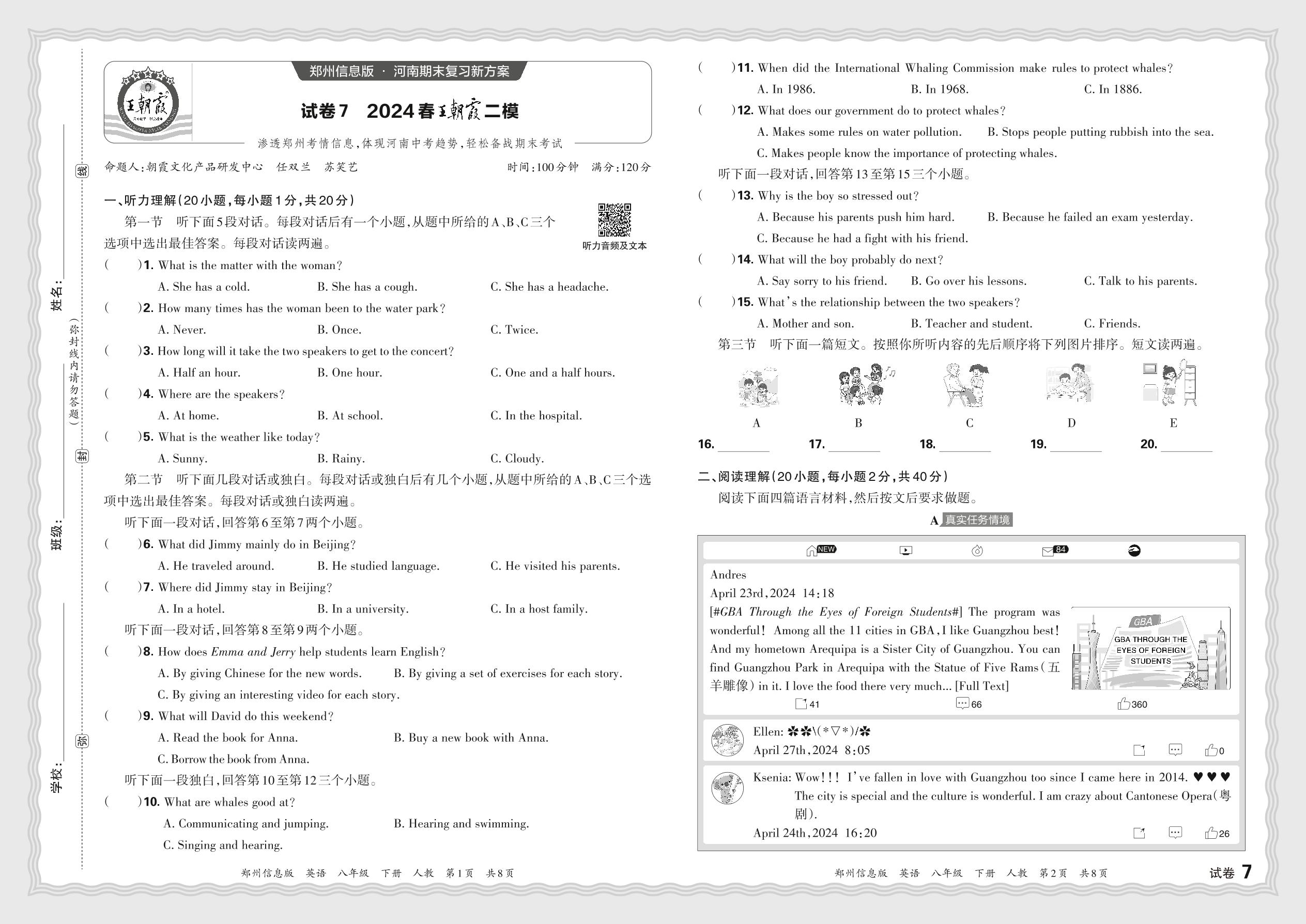 2024春下册八年级英语人教版 郑州期末王朝霞二模