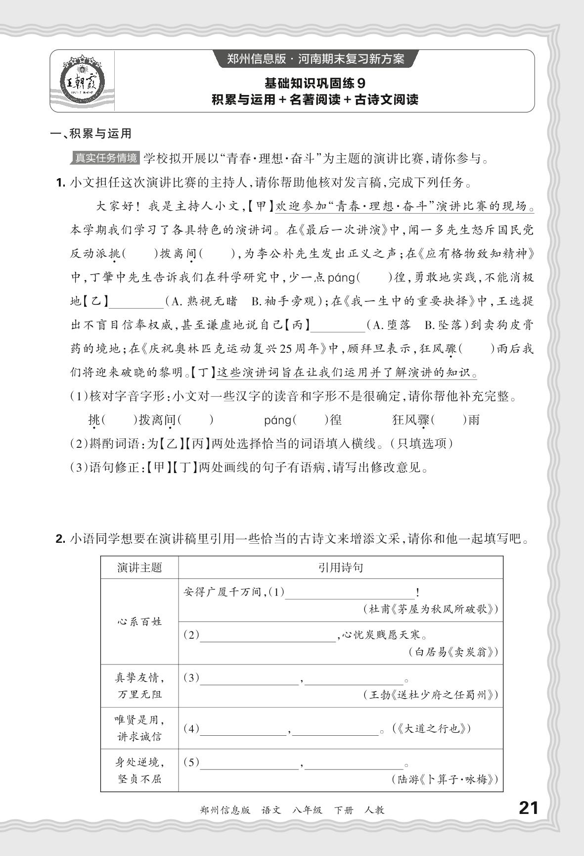 2024春下册八年级语文人教版 期末过课本郑州版·基础知识巩固练 积累运用+名著阅读+古诗文阅读【9】