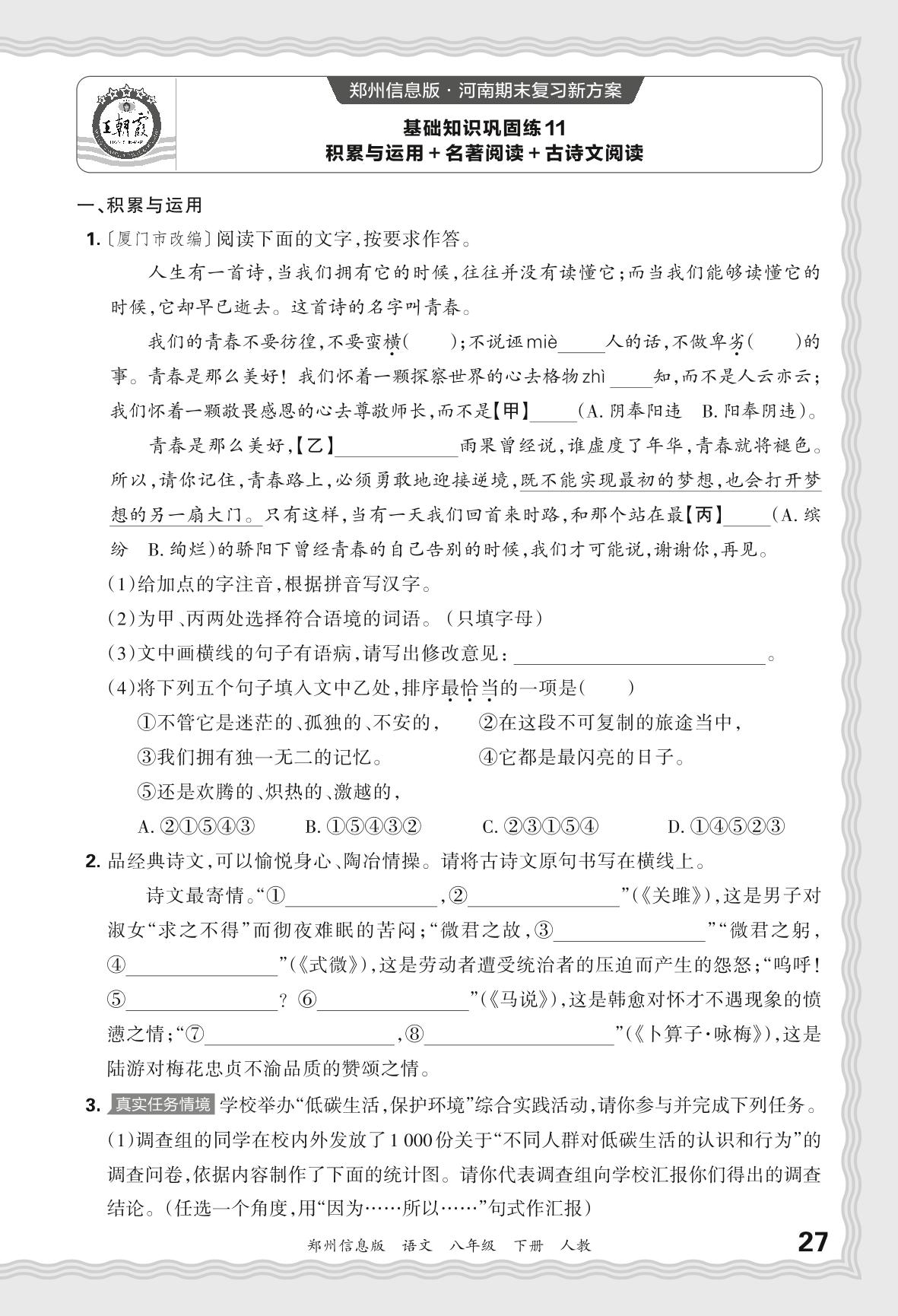 2024春下册八年级语文人教版 期末过课本郑州版·基础知识巩固练 积累运用+名著阅读+古诗文阅读【11】