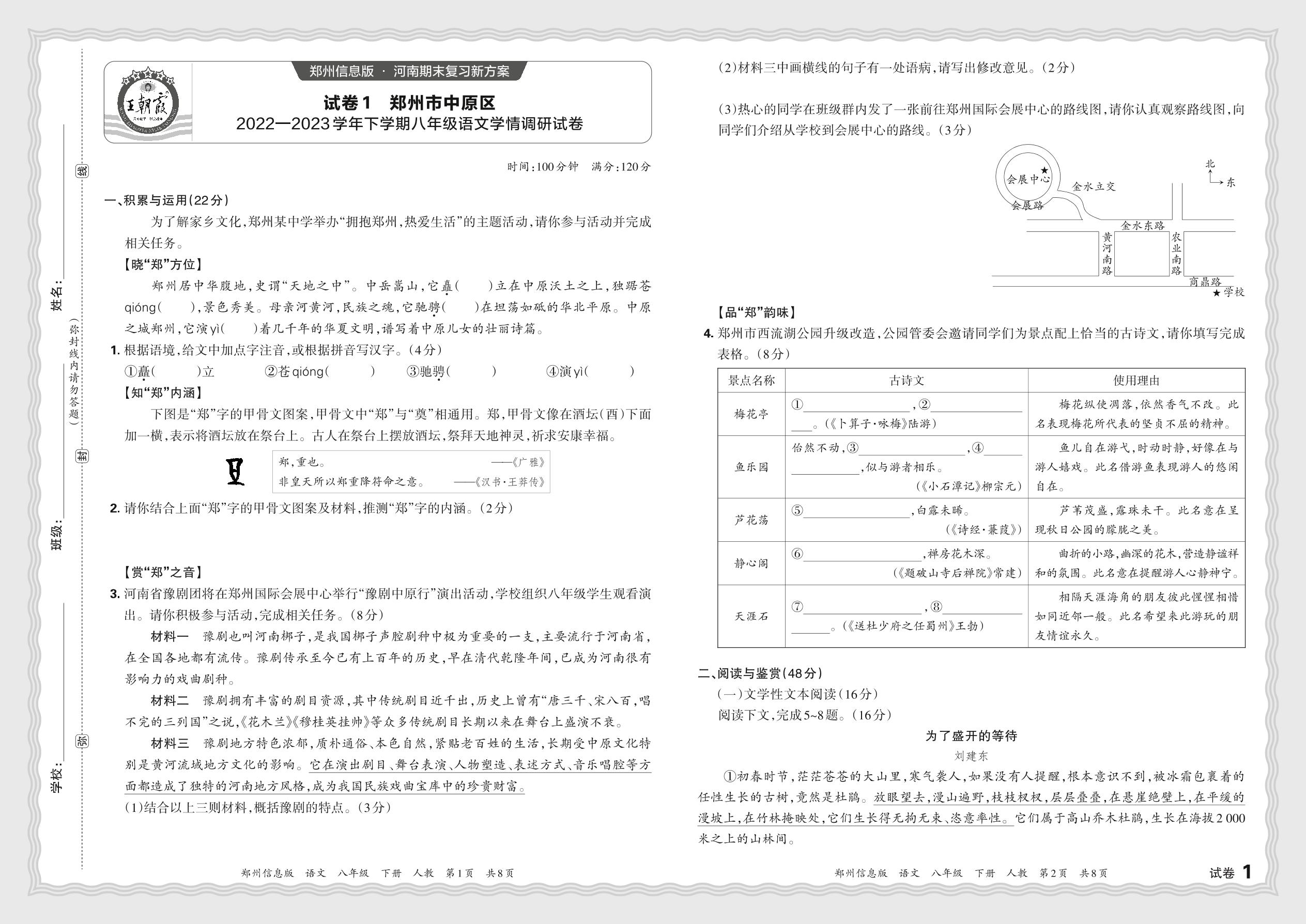 河南省郑州市中原区2022-2023学年下学期期末八年级语文学情调研试卷(人教版)【1】