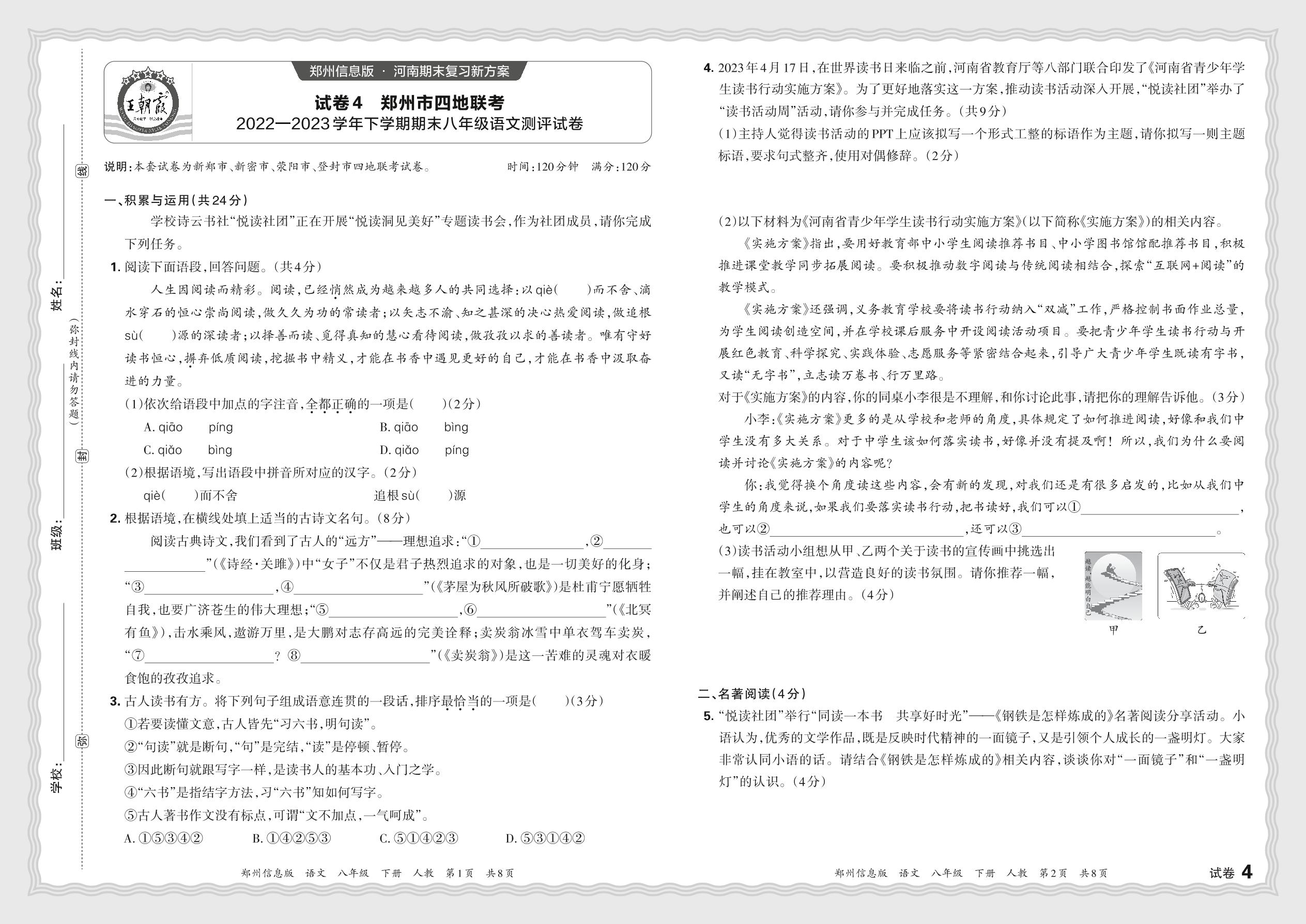 河南省郑州市四地联考2022-2023学年下学期期末八年级语文测评试卷(人教版)【4】