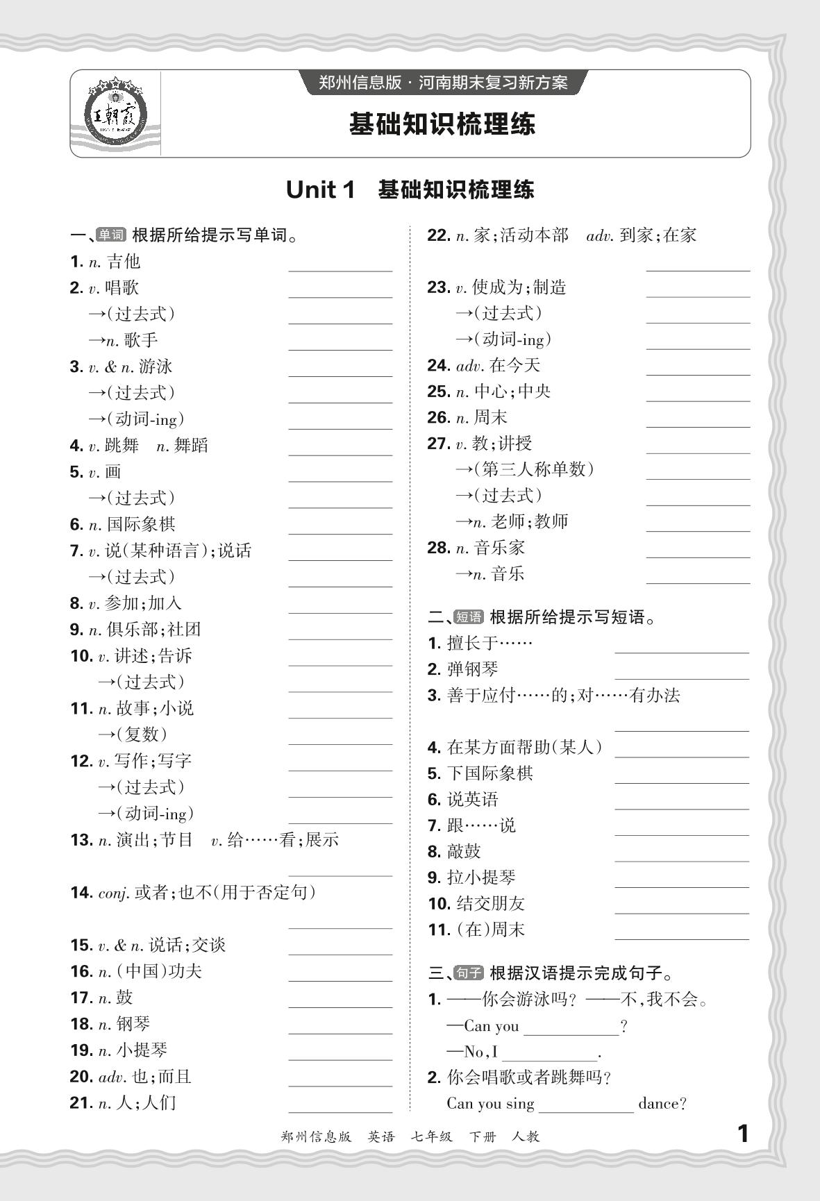 2024春下册七年级英语人教版 期末过课本郑州版·Unit 1 基础知识梳理练