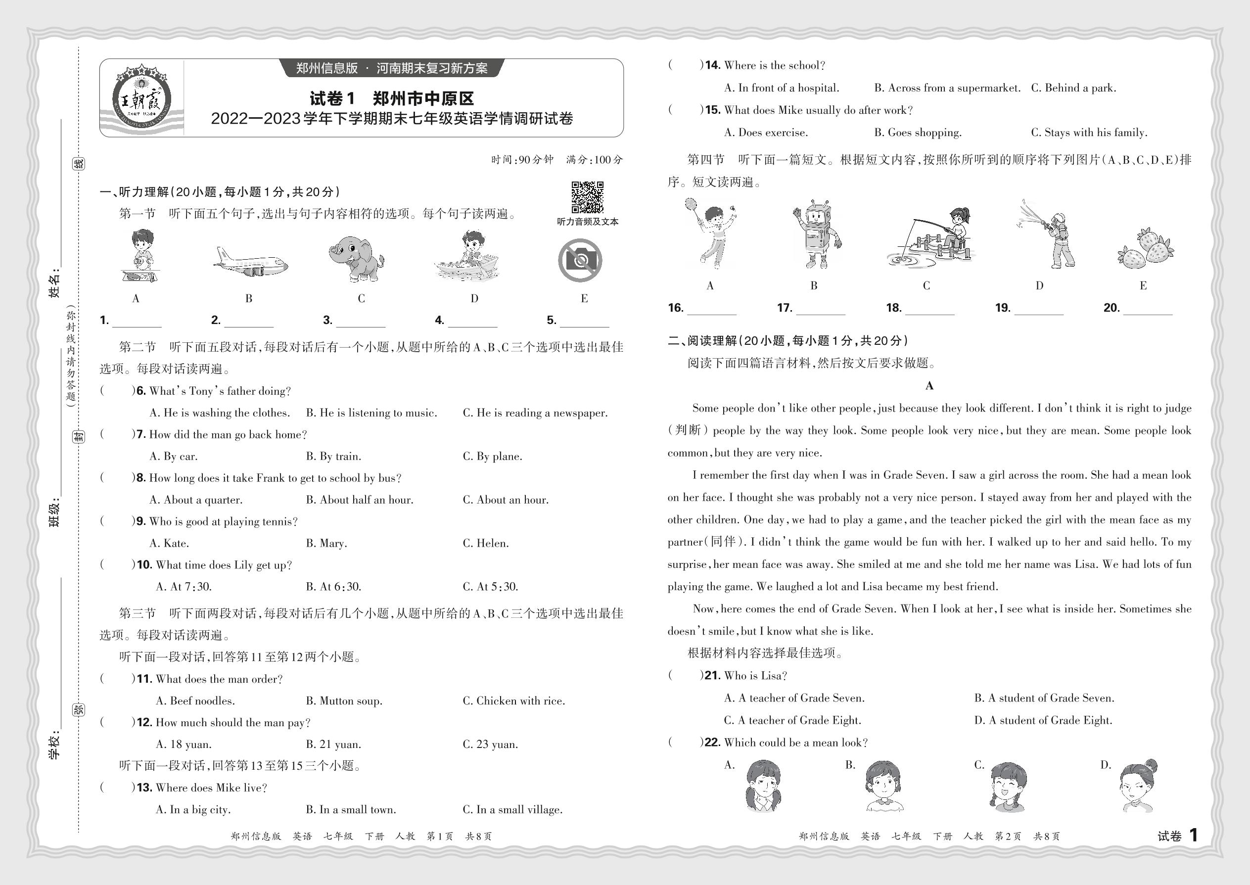 河南省郑州市中原区2022-2023学年下学期期末七年级英语学情调研试卷(人教版)【1】