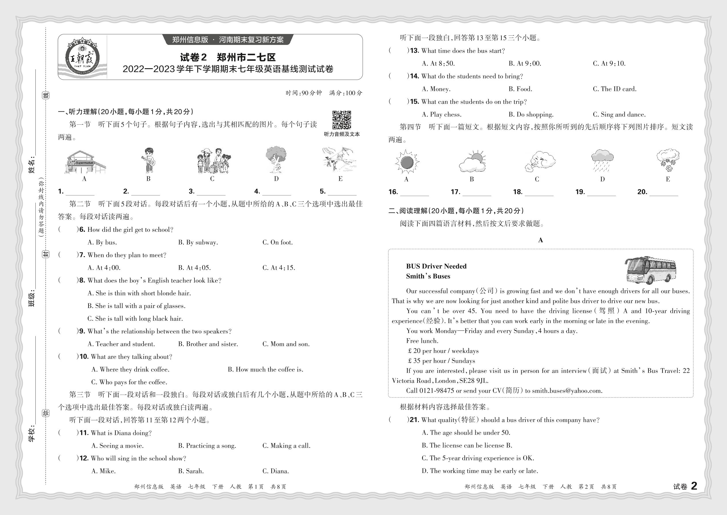河南省郑州市二七区2022-2023学年下学期期末七年级英语基线测试试卷(人教版)【2】