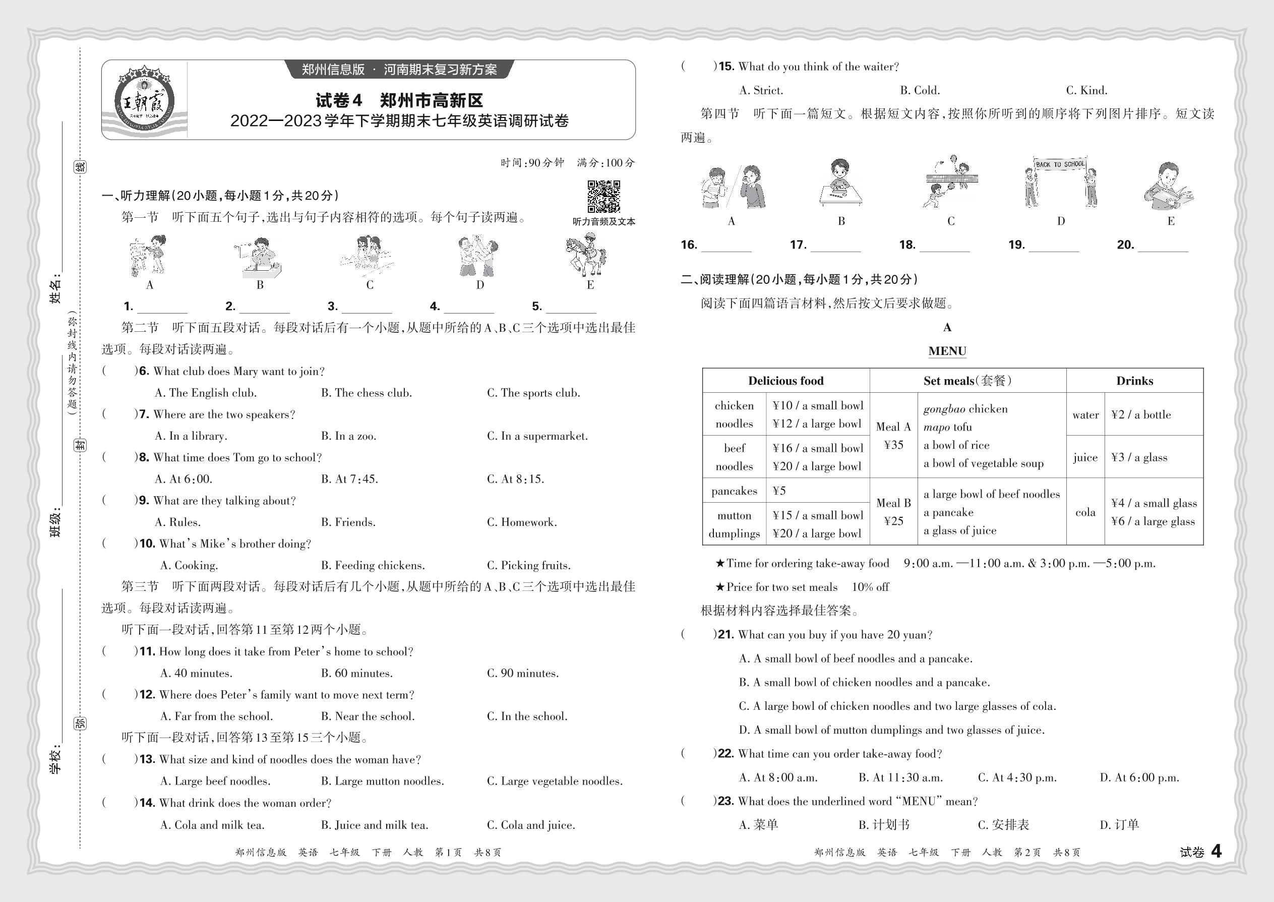 河南省郑州市高新区2022-2023学年下学期期末七年级英语调研试卷(人教版)【4】