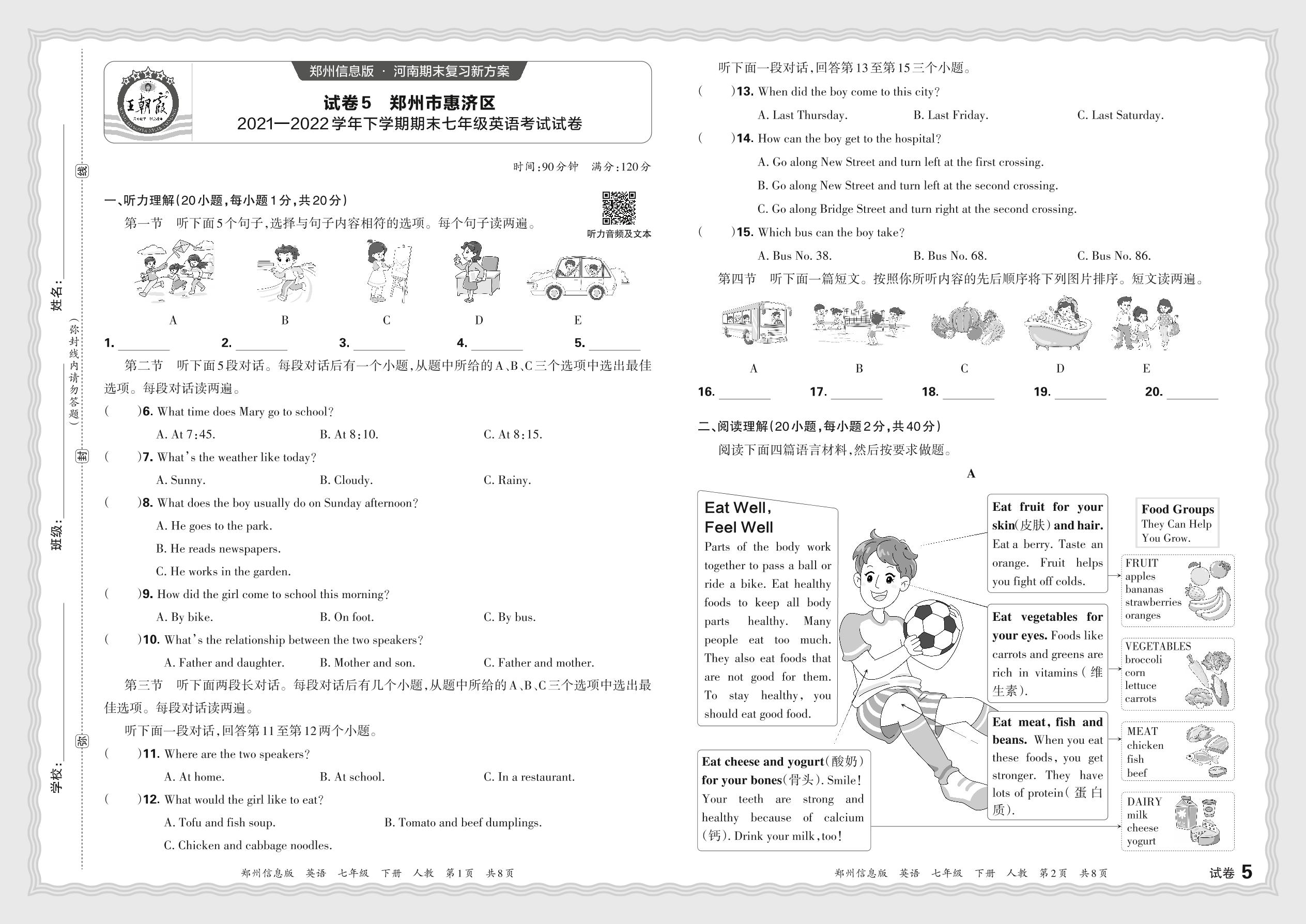 河南省郑州市惠济区2021-2022学年下学期期末七年级英语考试试卷(人教版)【5】