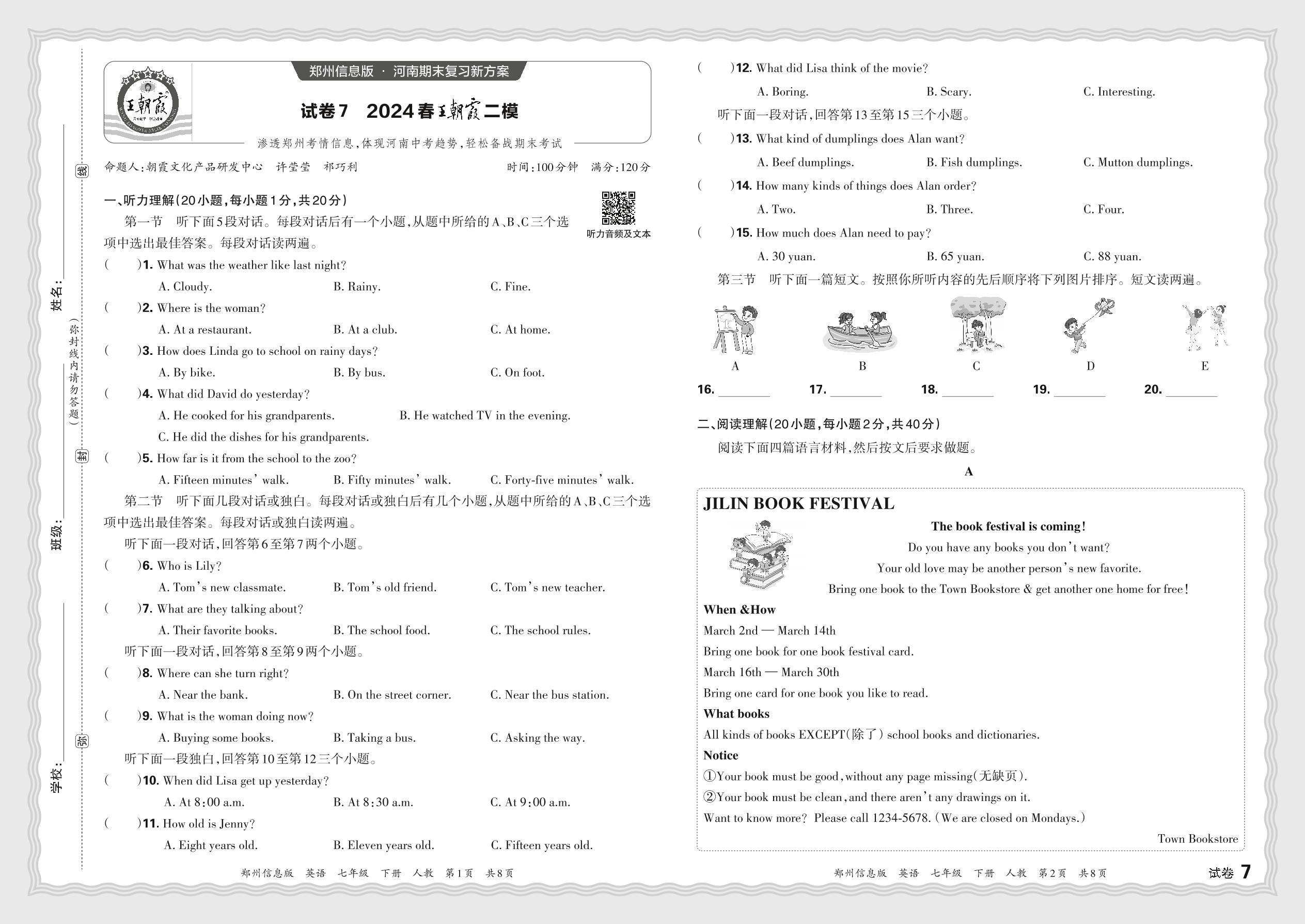 2024春下册七年级英语人教版 郑州期末王朝霞二模