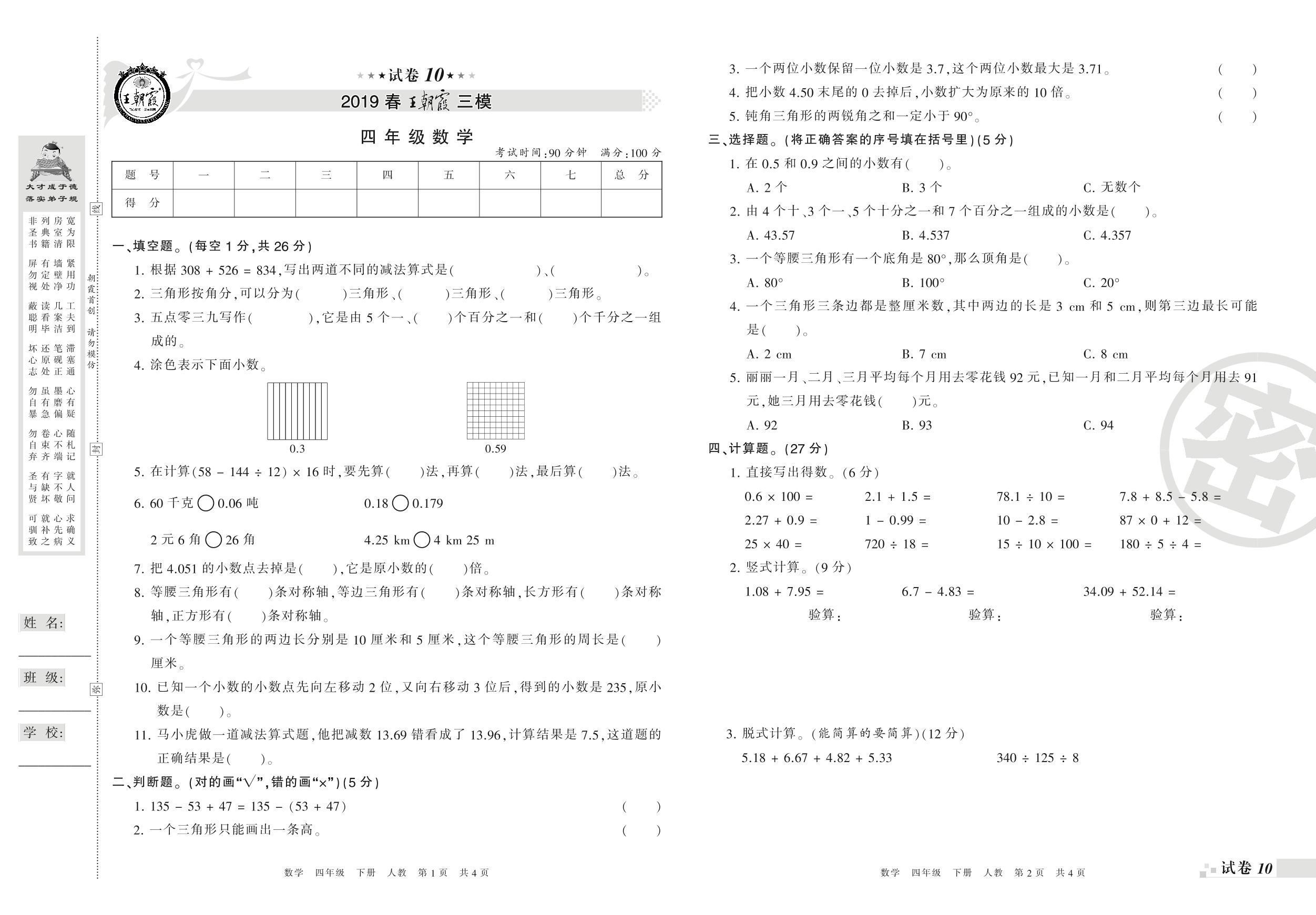 王朝霞期末模拟卷四年级下册数学(人教版)【10】