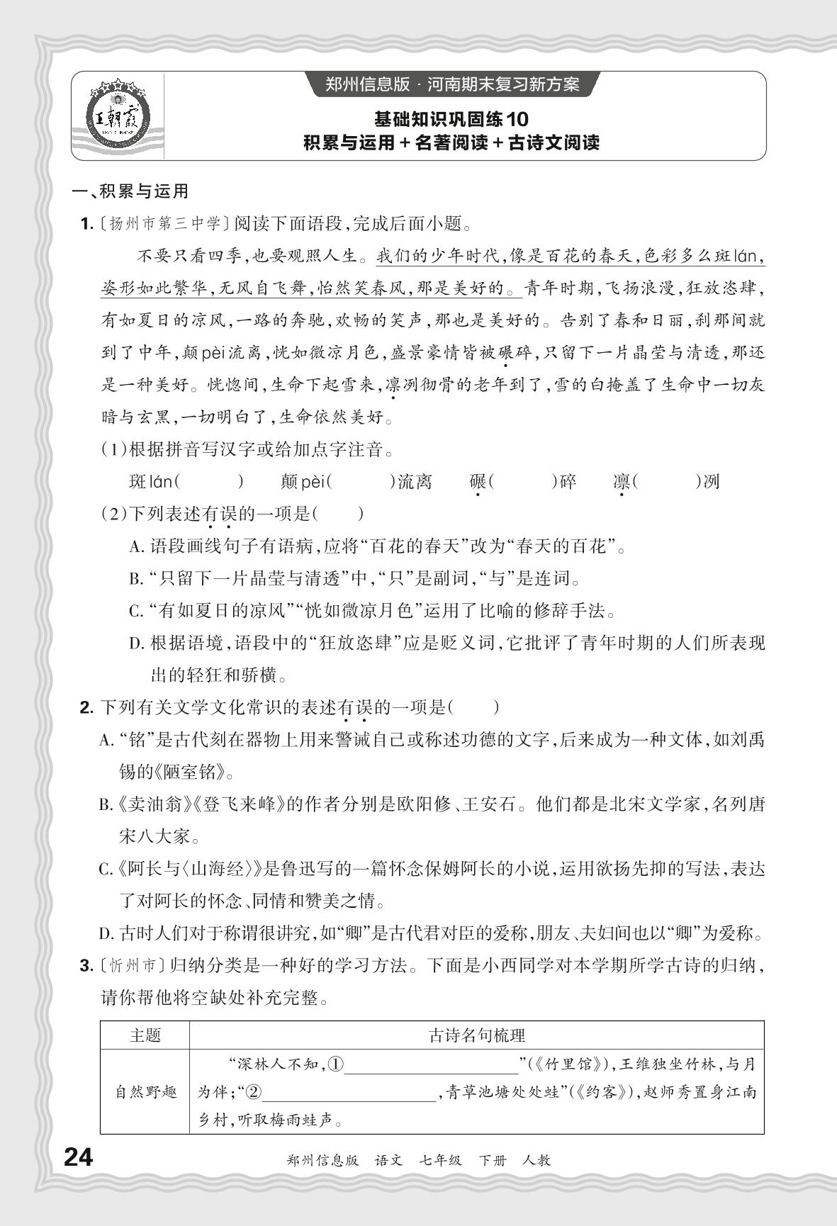 2024春下册七年级语文人教版 期末过课本郑州版·基础知识巩固练 积累运用+名著阅读+古诗文阅读【10】