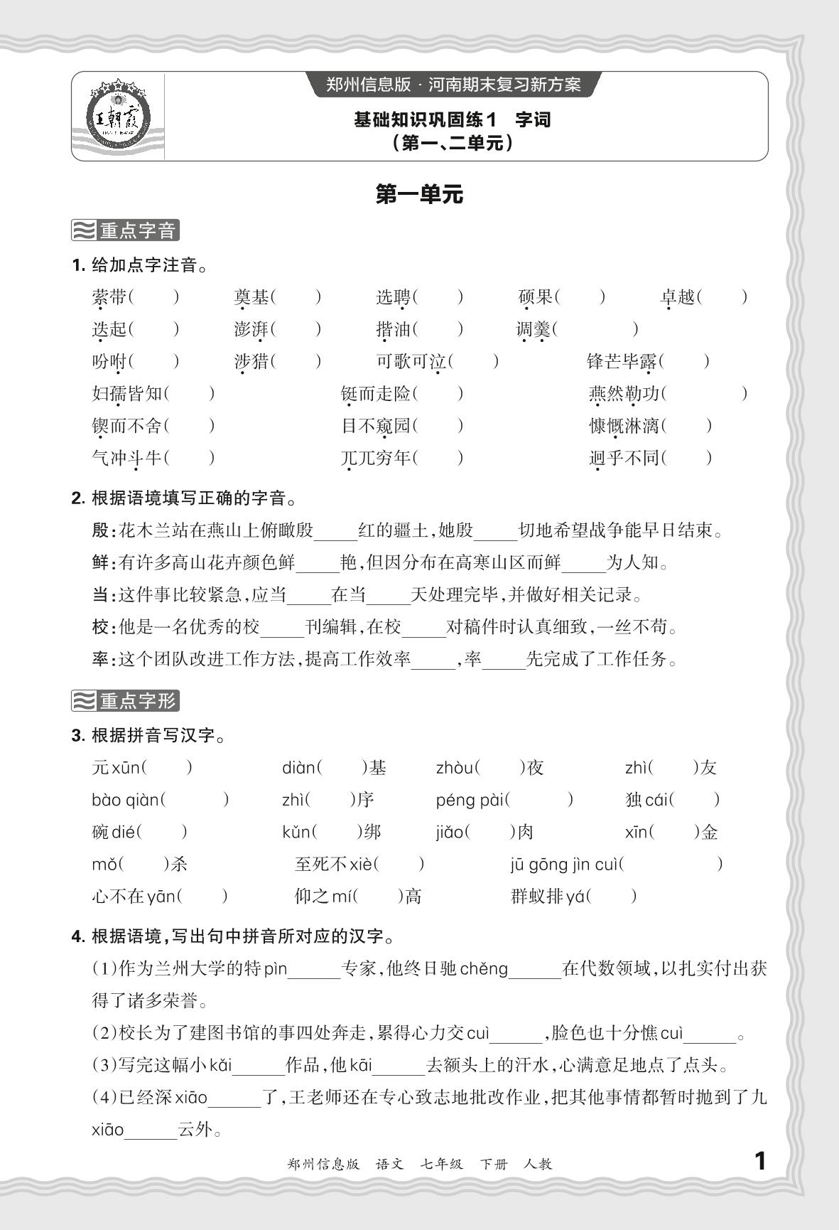 2024春下册七年级语文人教版 期末过课本郑州版·基础知识巩固练 字词(第一、二单元)【1】