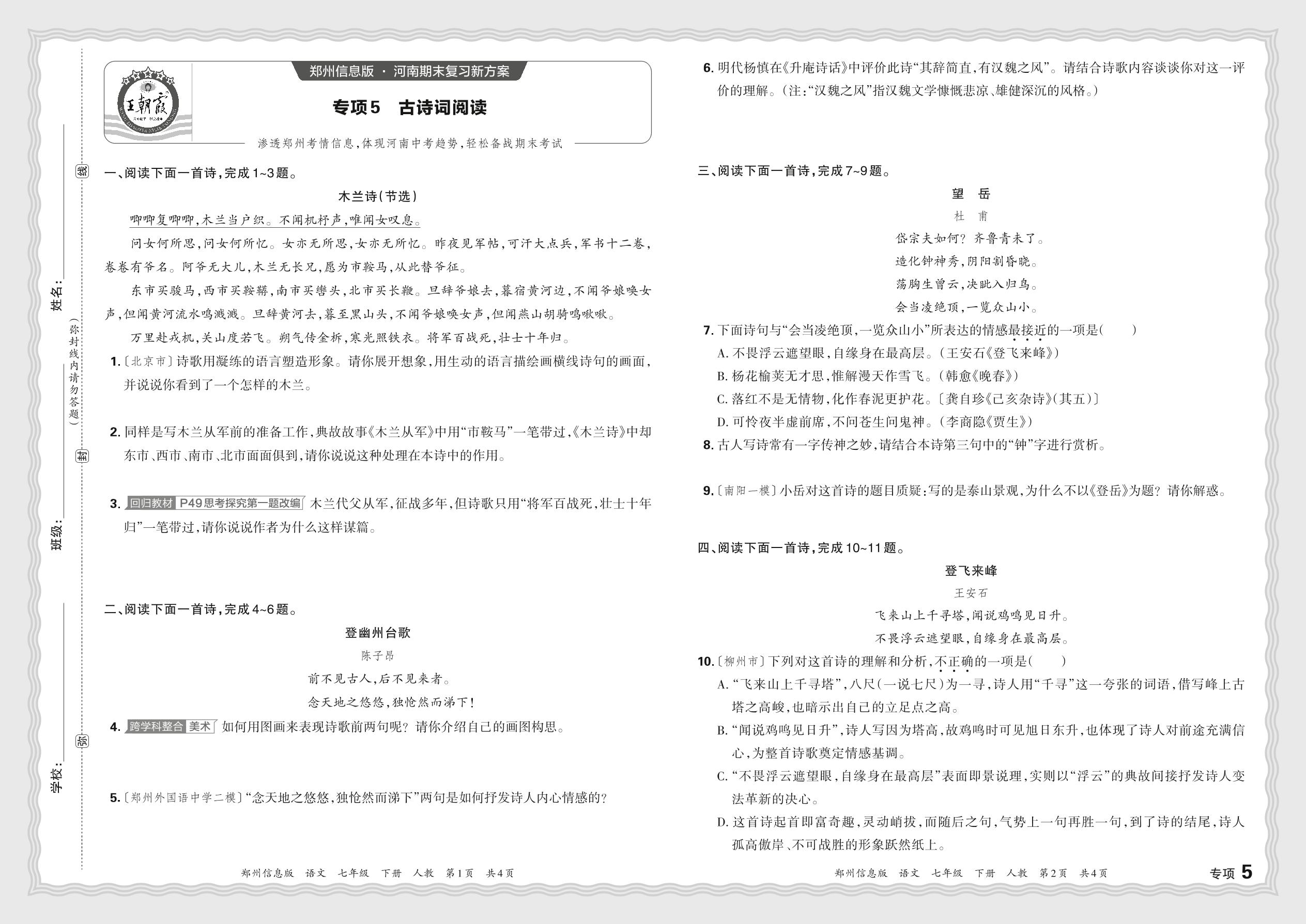 2024春下册七年级语文人教版 期末专项卷郑州版·古诗词阅读【5】