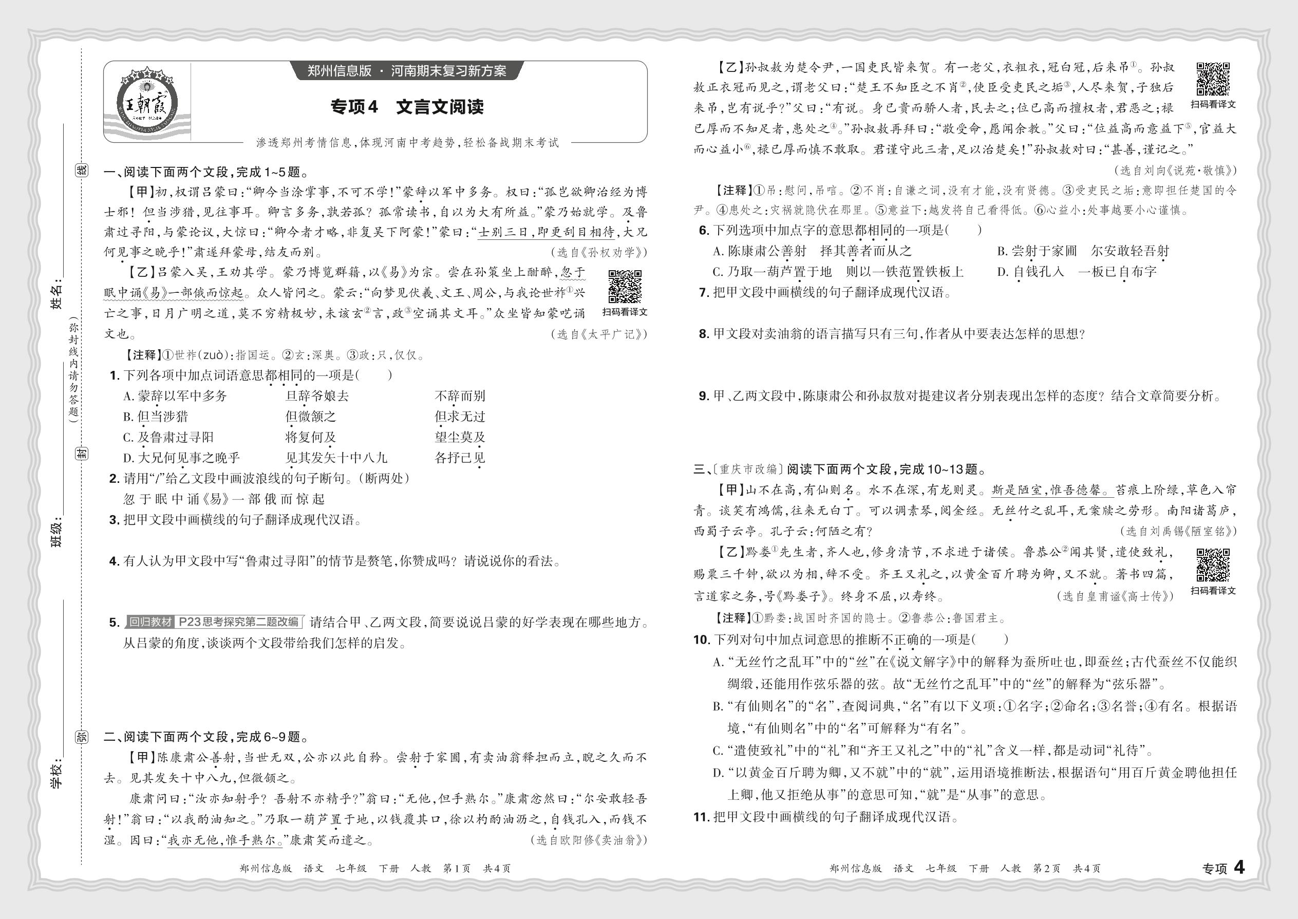 2024春下册七年级语文人教版 期末专项卷郑州版·文言文阅读【4】