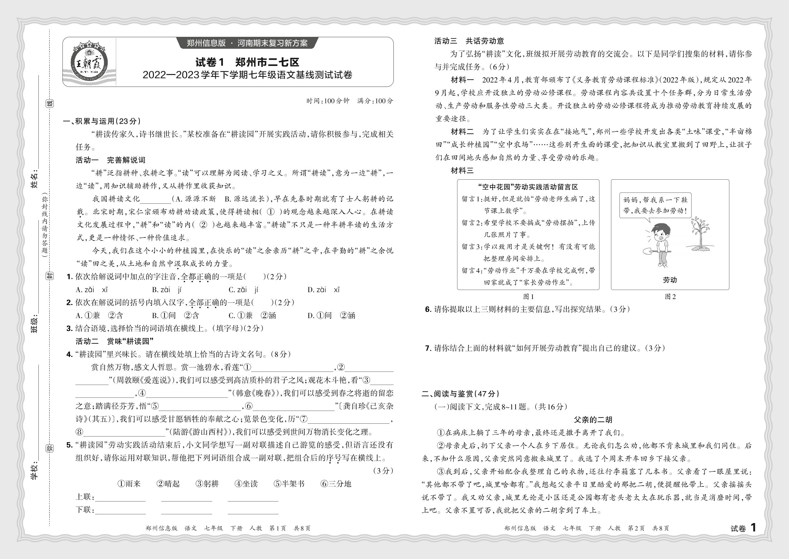 河南省郑州市二七区2022-2023学年下学期期末七年级语文基线测试试卷(人教版)【1】