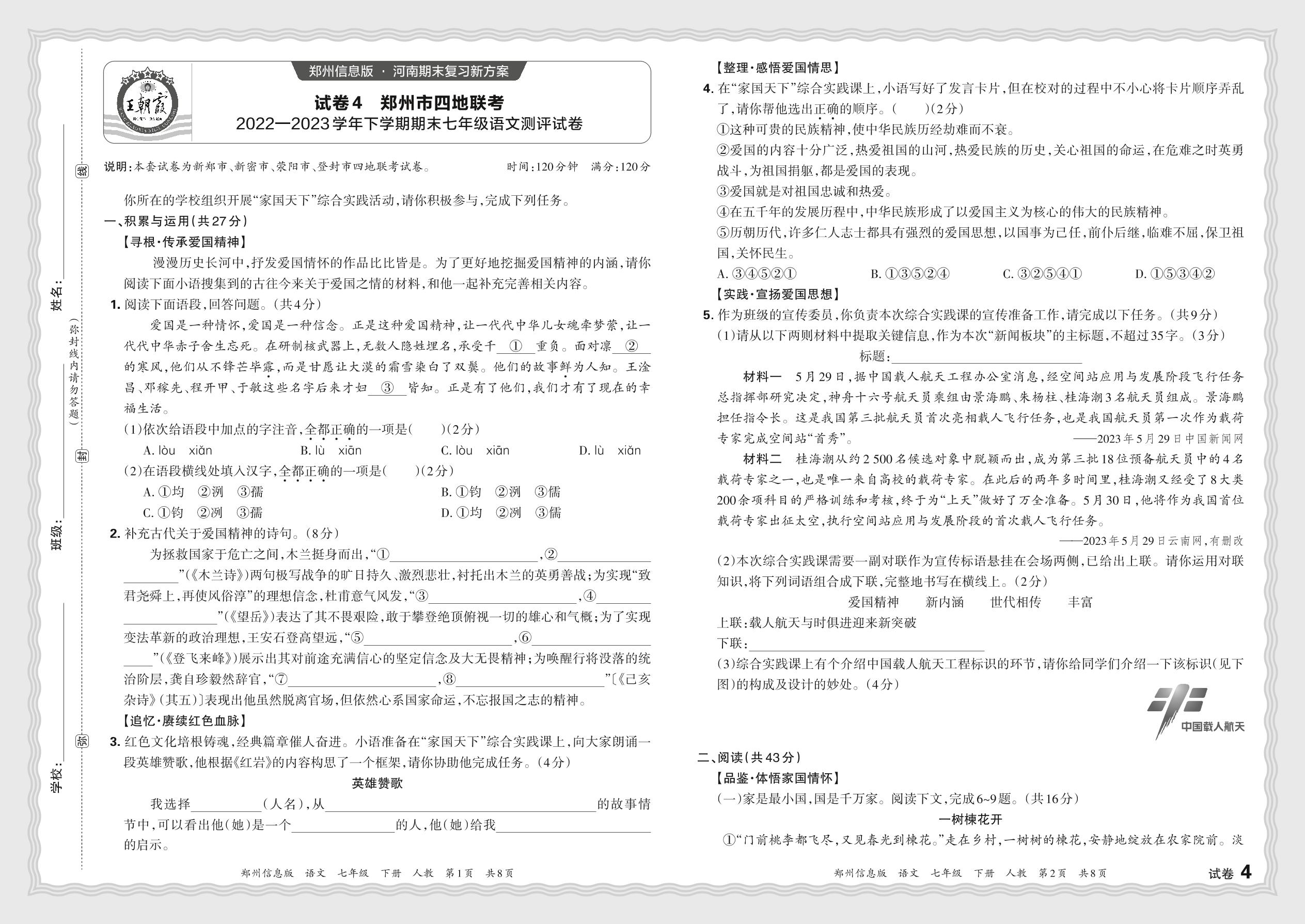 河南省郑州市四地联考2022-2023学年下学期期末七年级语文测评试卷(人教版)【4】
