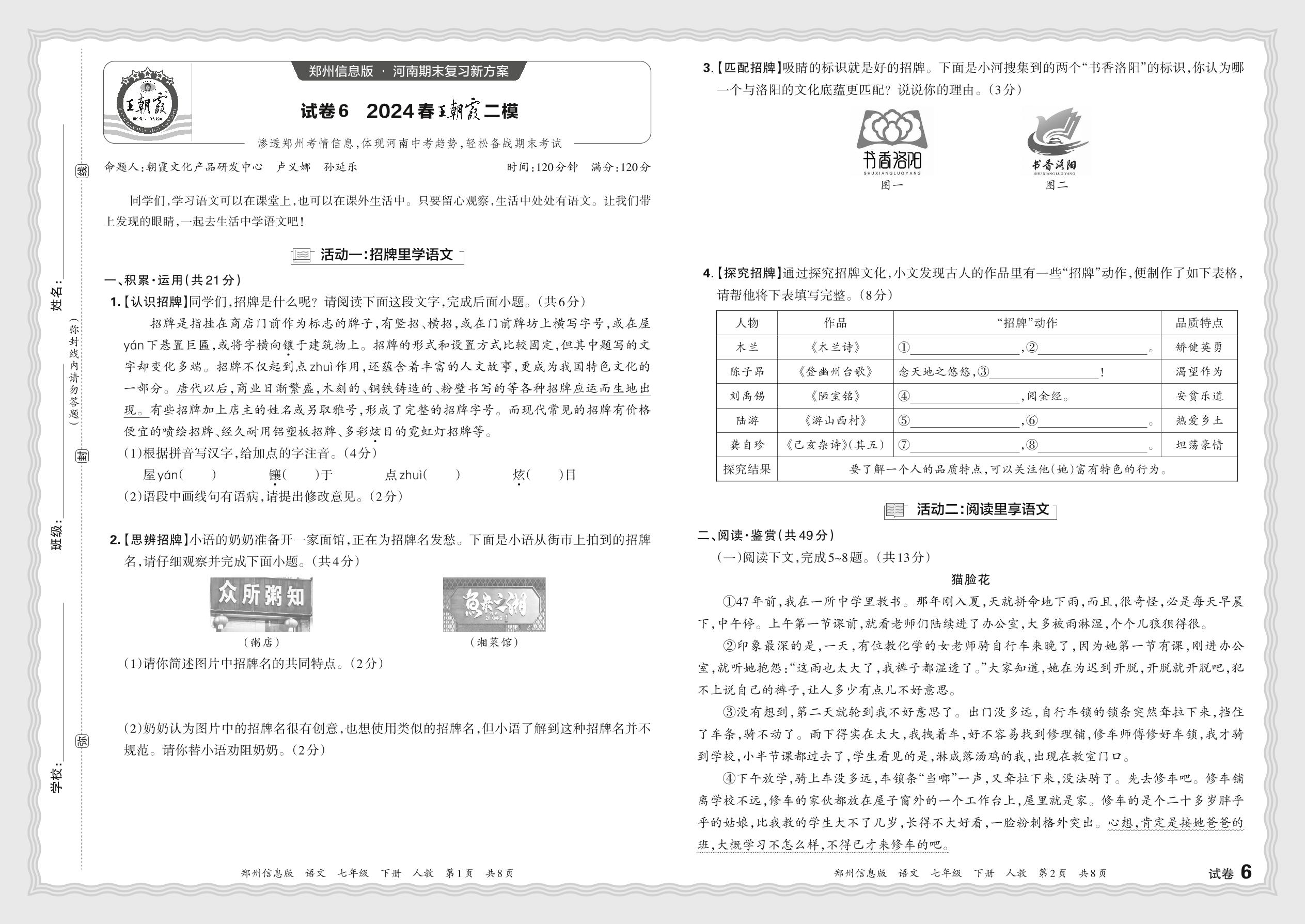 2024春下册七年级语文人教版 郑州期末王朝霞二模