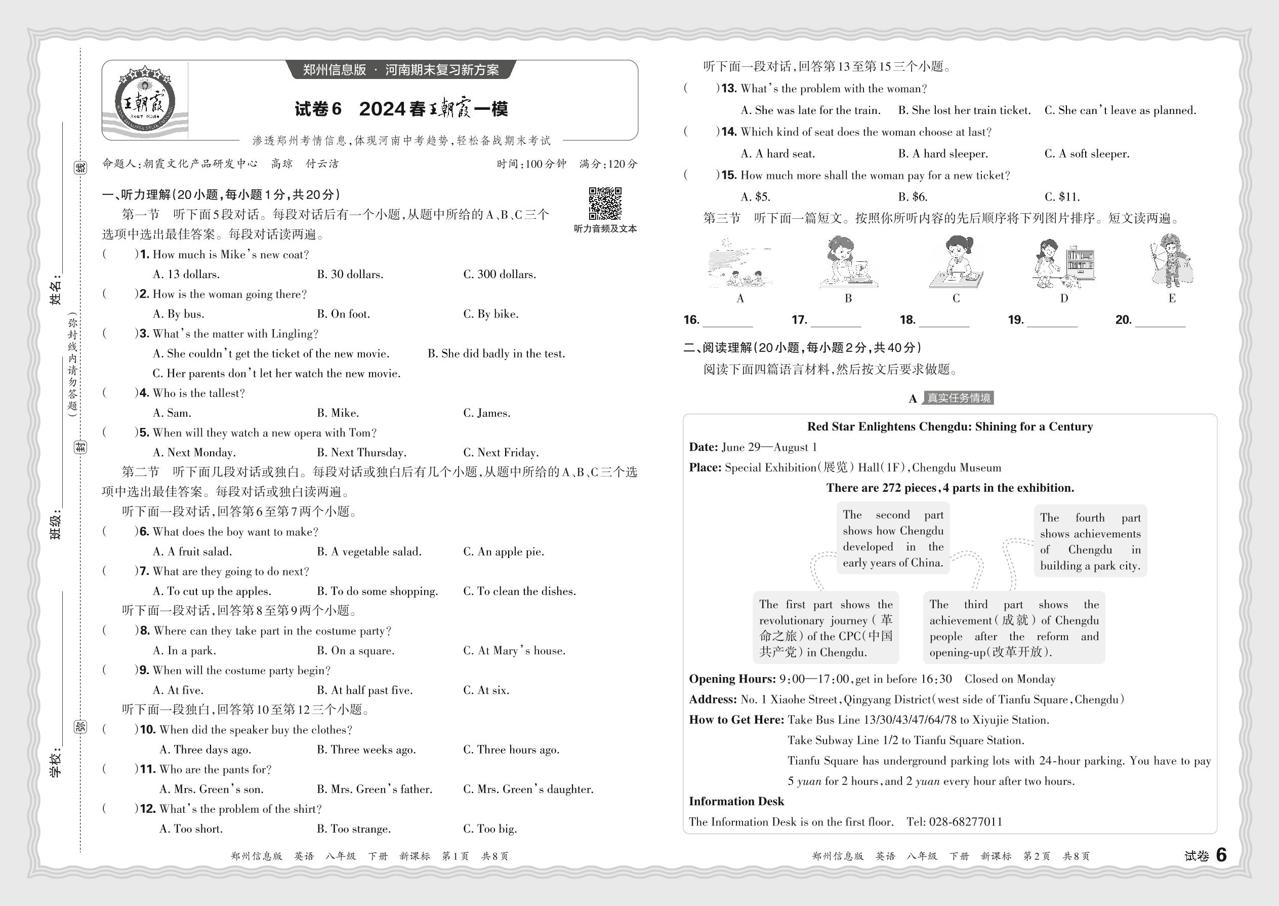 2024春下册八年级英语新课标版 郑州期末王朝霞一模