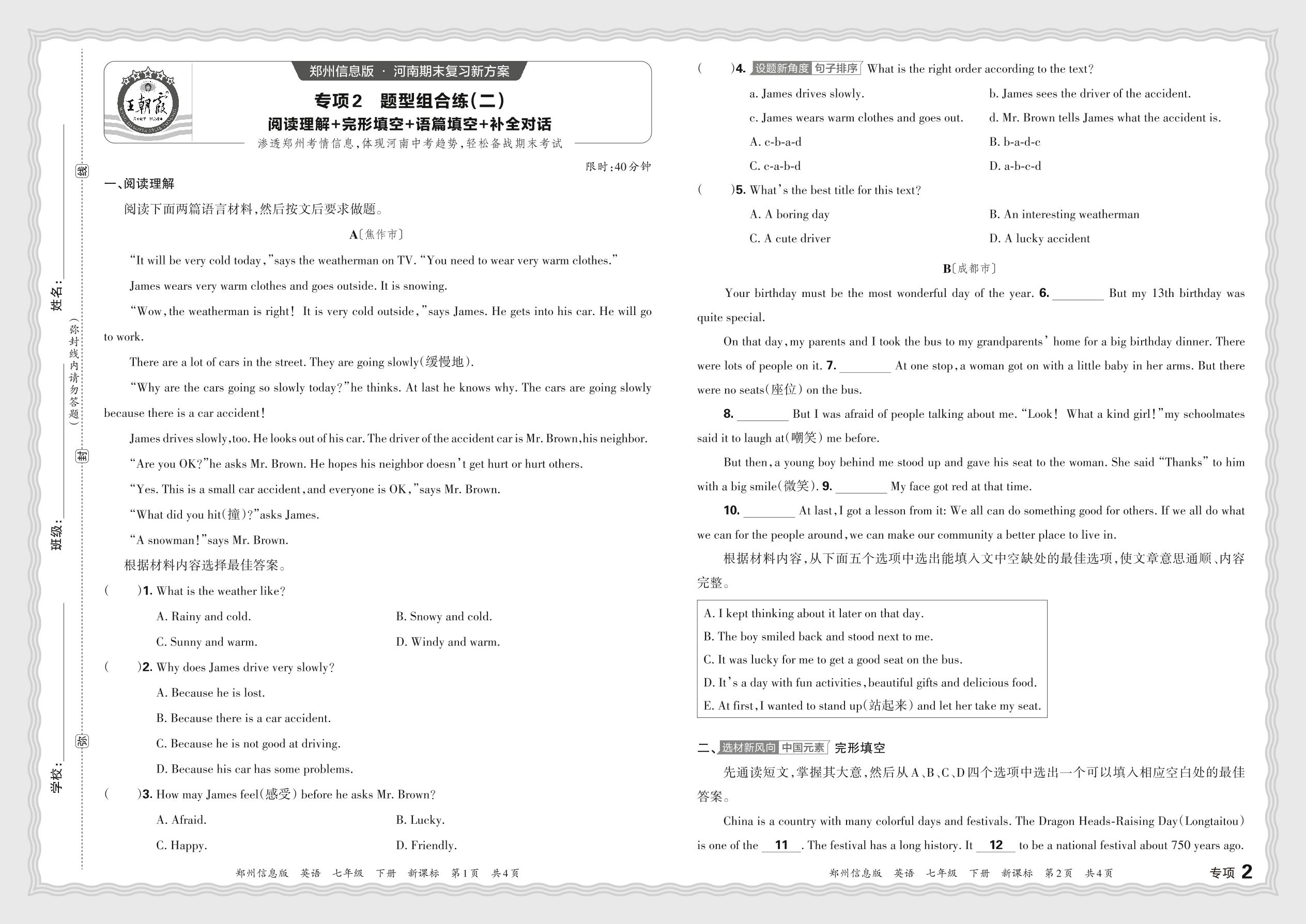 2024春下册七年级英语新课标版 期末专项卷郑州版·题型组合练(二)