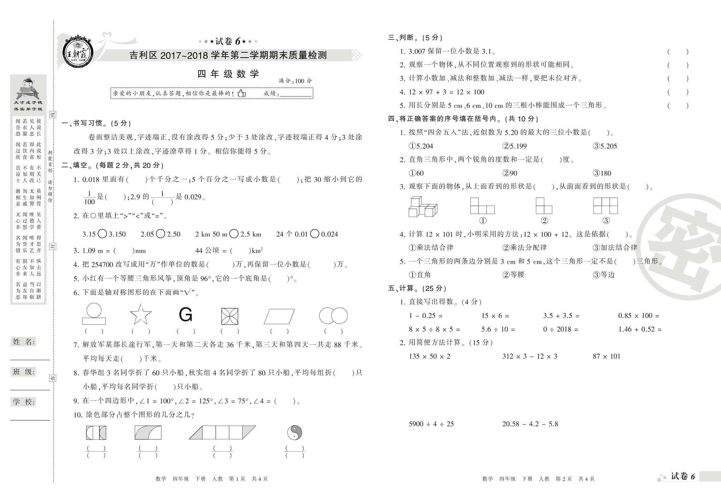 2017-2018学年第二学期洛阳市吉利区四年级数学试卷(人教版)【6】