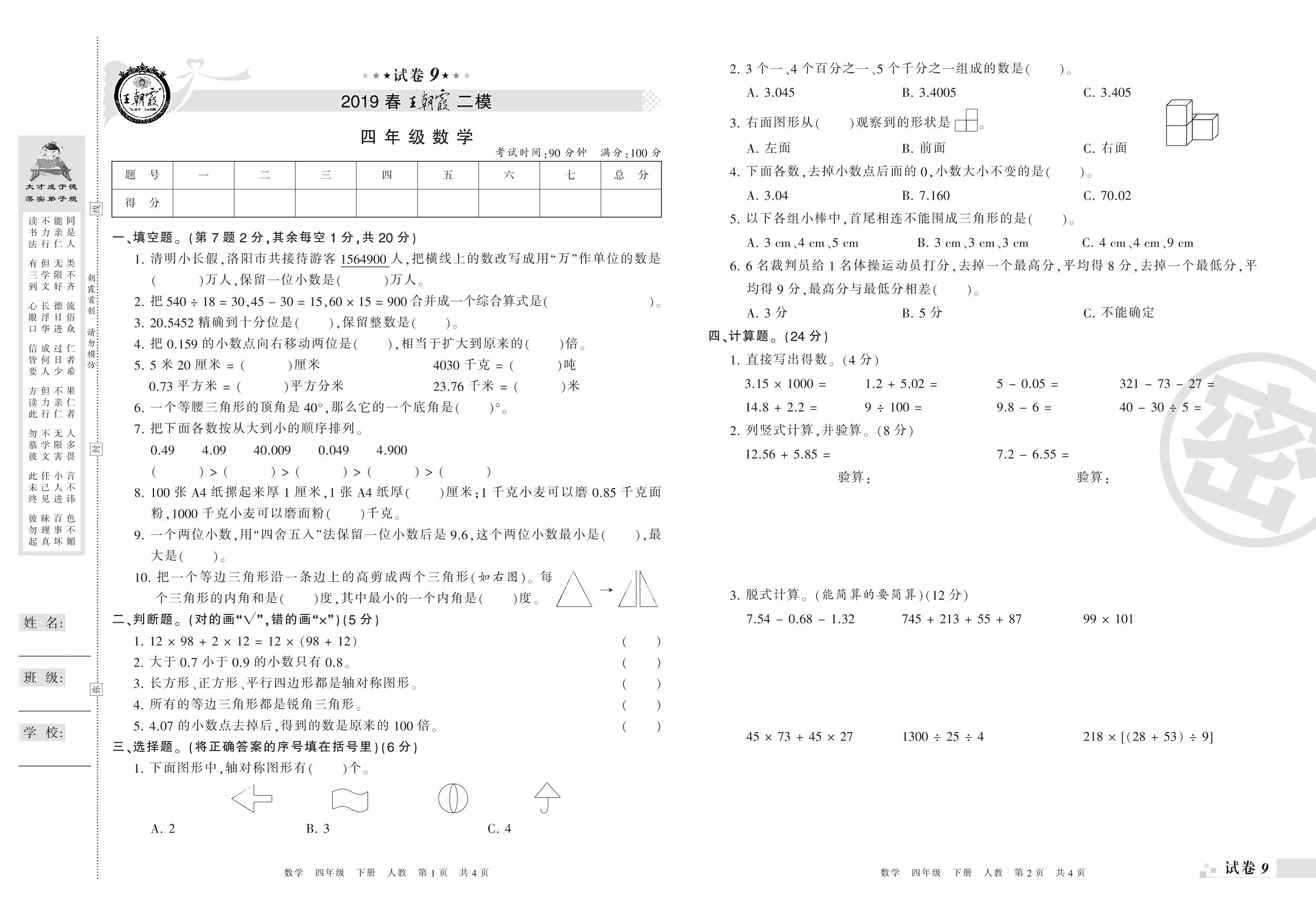 王朝霞期末模拟卷四年级下册数学(人教版)_R210804144403【9】