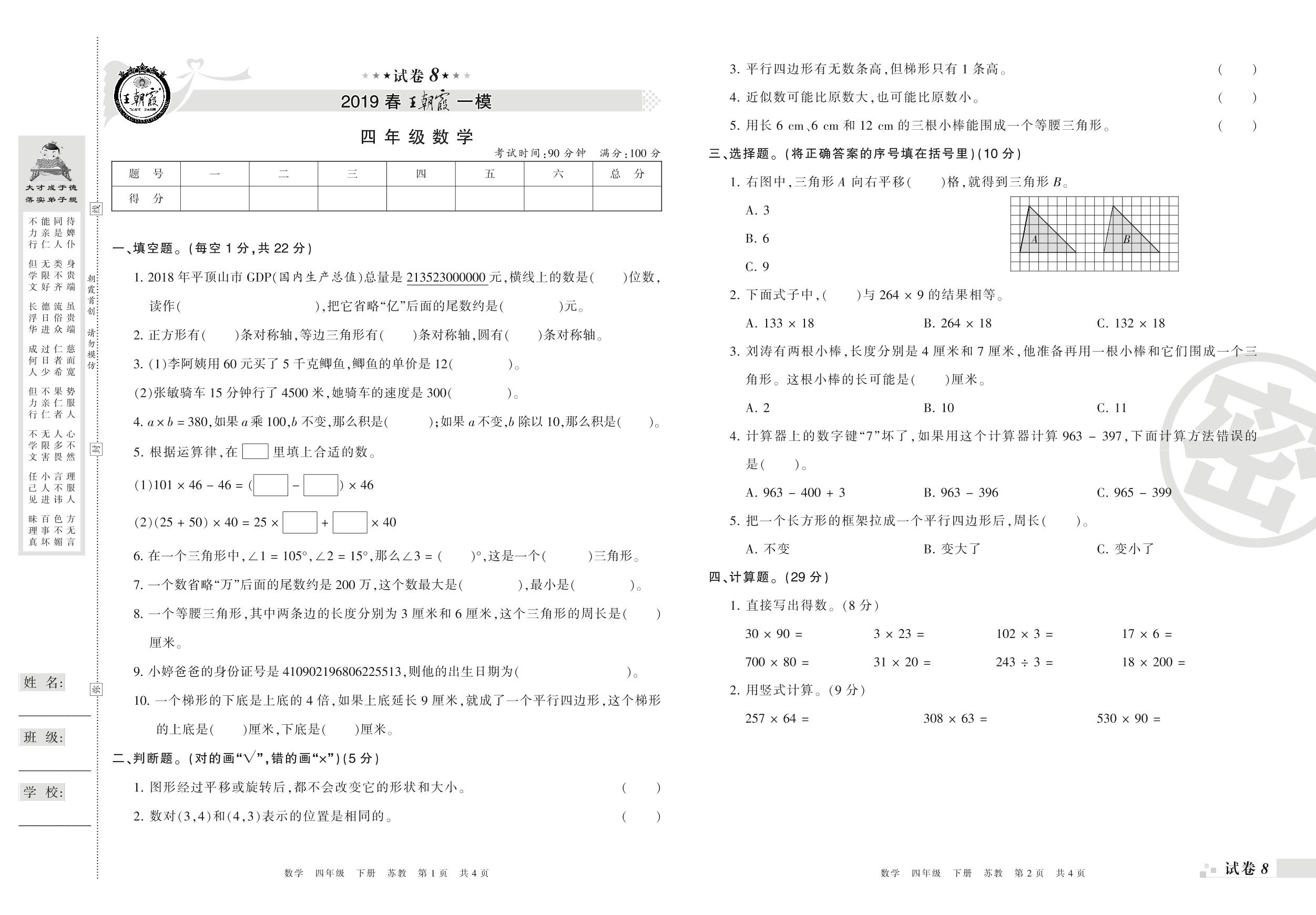 王朝霞期末模拟卷四年级下册数学(苏教版)_R210804144447【8】