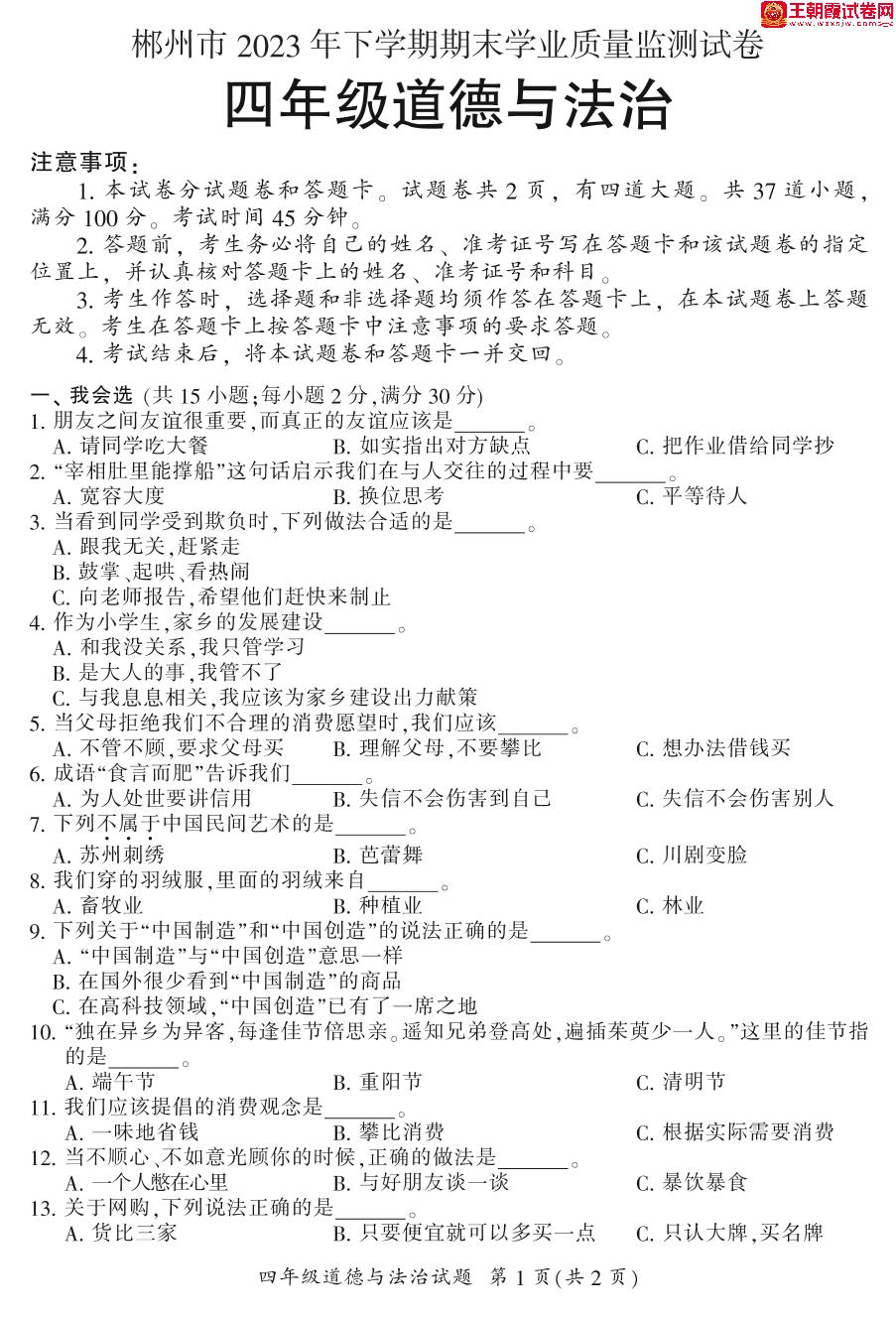 湖南省郴州市2022-2023学年下学期期末学业质量监测试卷四年级道德与法治(人教版)