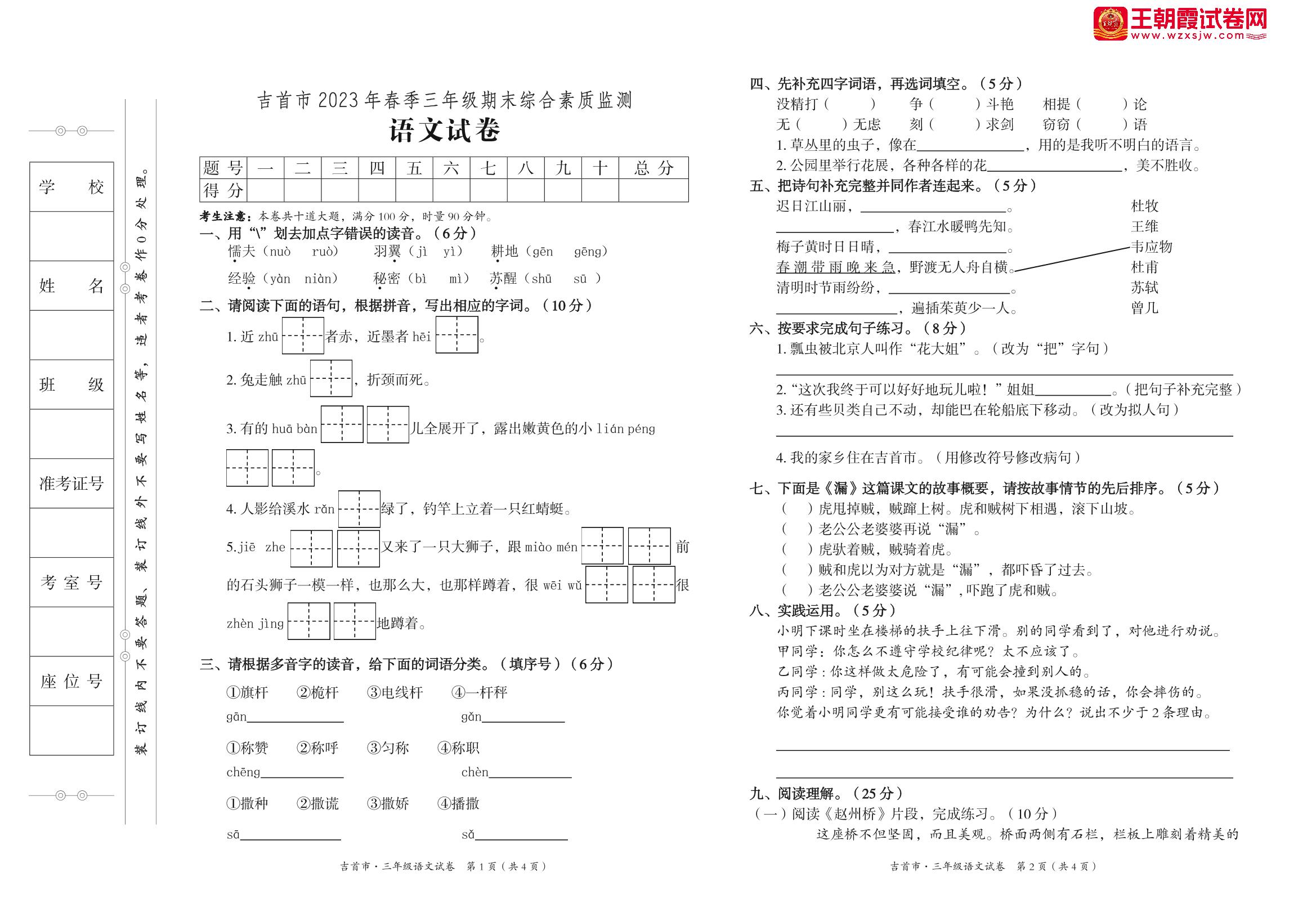 湖南省湘西州吉首市2023年春季期末综合素质监测三年级语文(人教版)