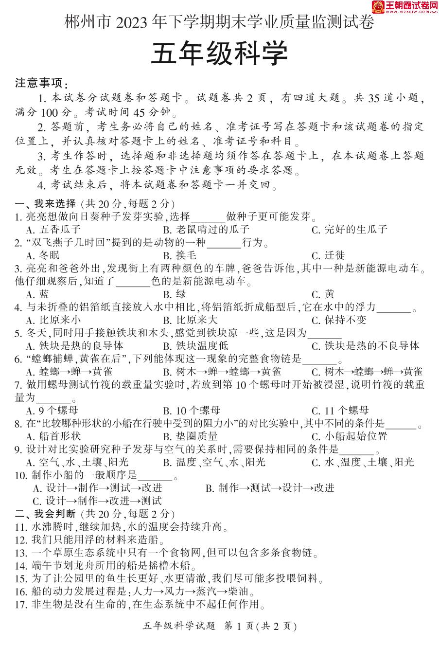 湖南省郴州市2022-2023学年下学期期末学业质量监测试卷五年级科学(教科版)