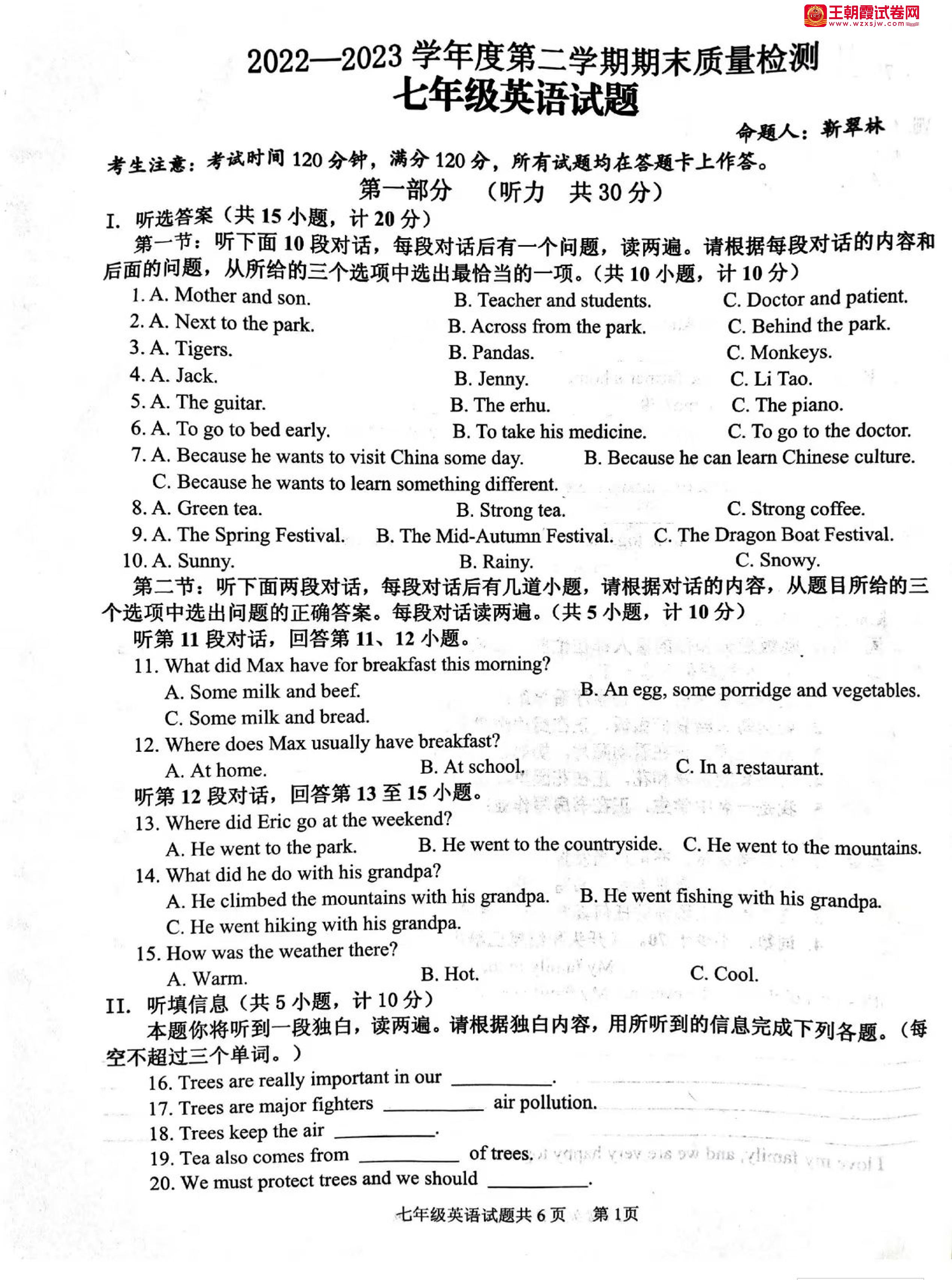 陕西省西安市鄠邑区2022-2023学年度第二学期期末质量检测七年级英语(沪教版)【无听力音频】