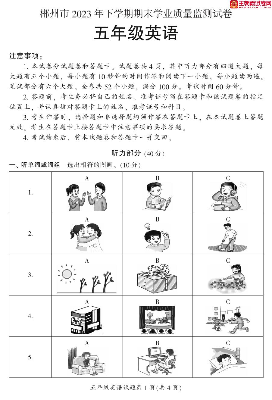 湖南省郴州市2022-2023学年下学期期末学业质量监测试卷五年级英语(湘少版)【无听力音频】
