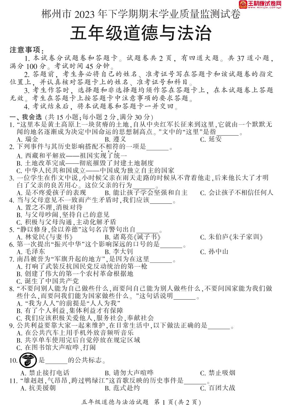 湖南省郴州市2022-2023学年下学期期末学业质量监测试卷五年级道德与法治(人教版)