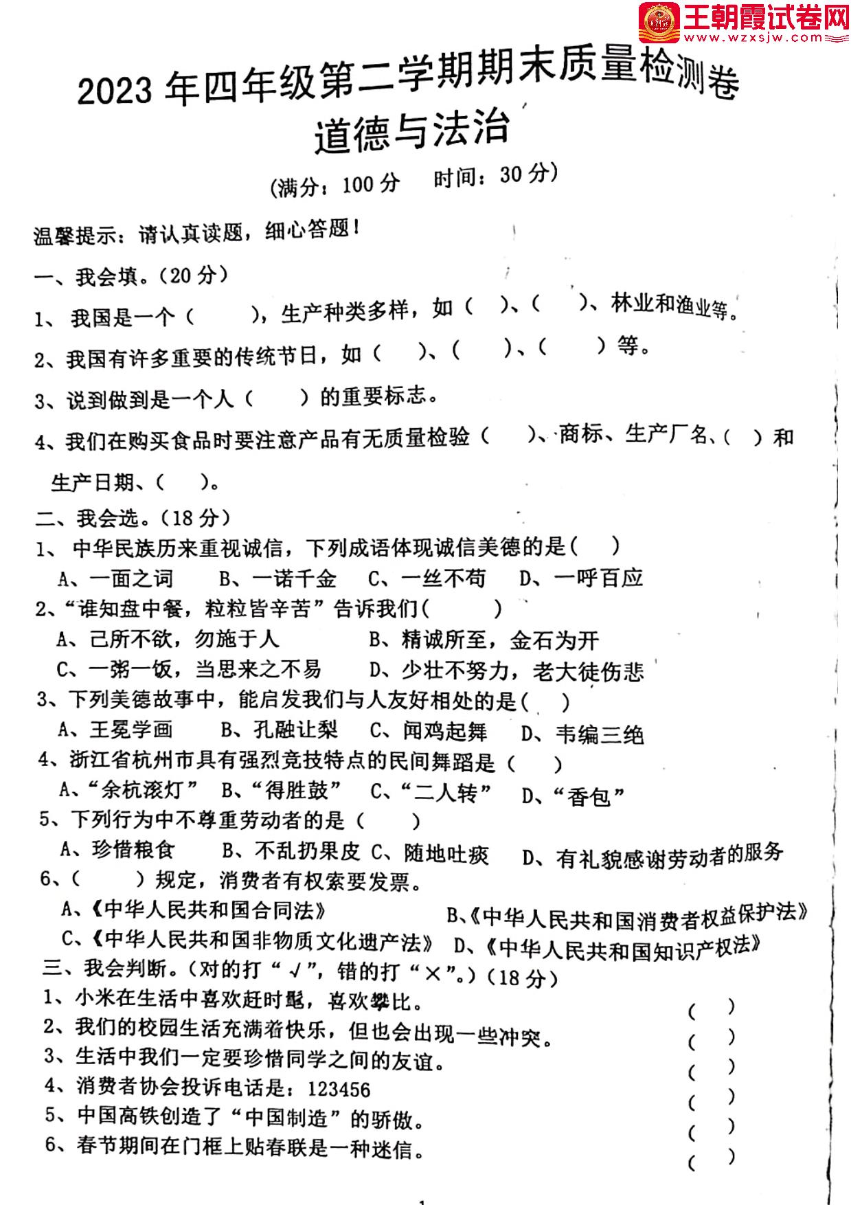 湖南省娄底市双峰县2022-2023学年第二学期期末质量检测试卷四年级道德与法治(人教版)