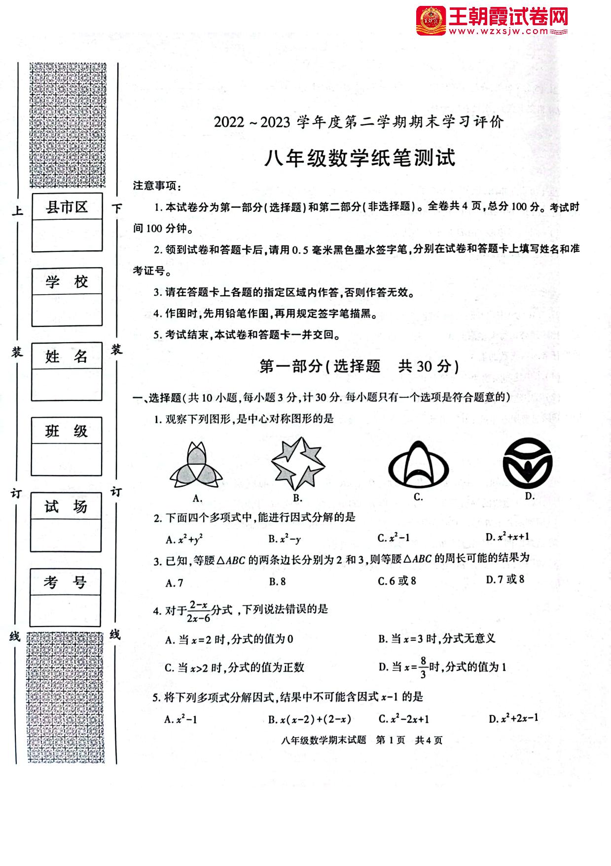 陕西省西安市长安区2022-2023学年度第二学期期末学习评价八年级数学(北师版)
