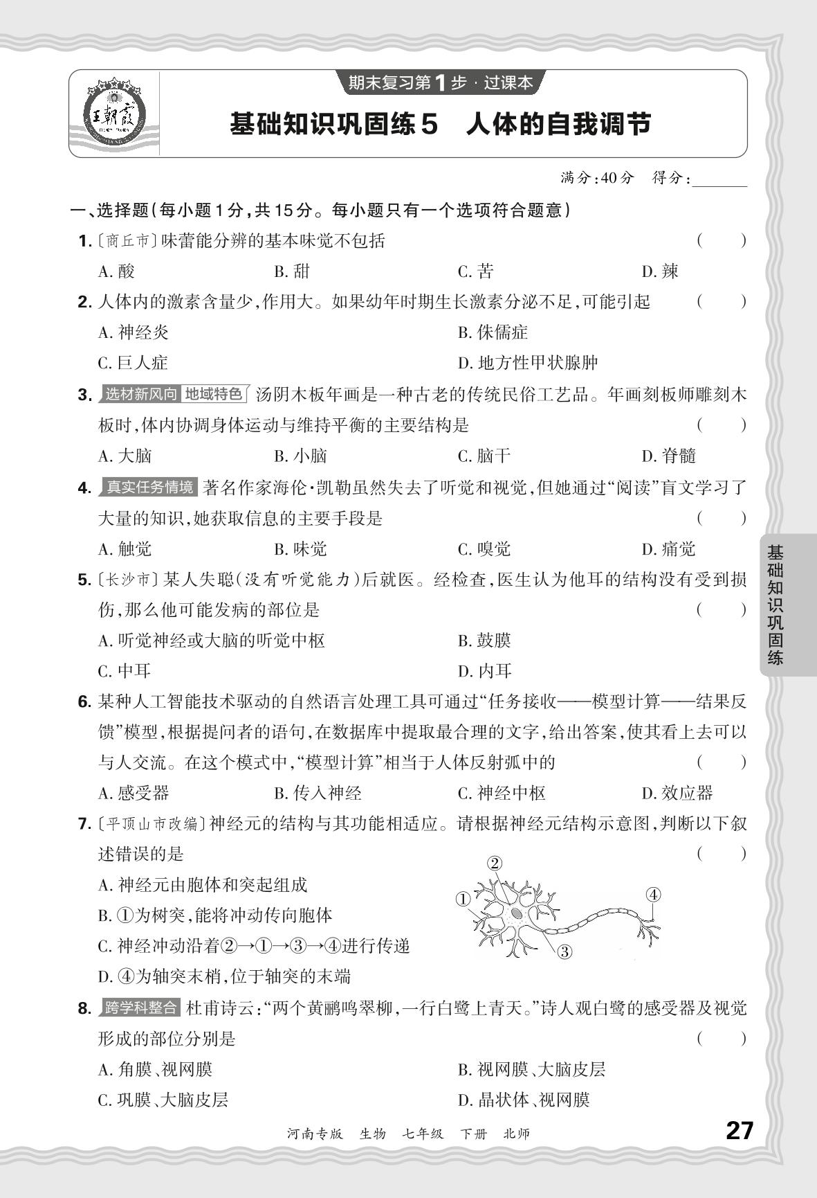 2024春下册七年级生物北师版 期末过课本河南版·基础知识巩固练 人体的自我调节【5】