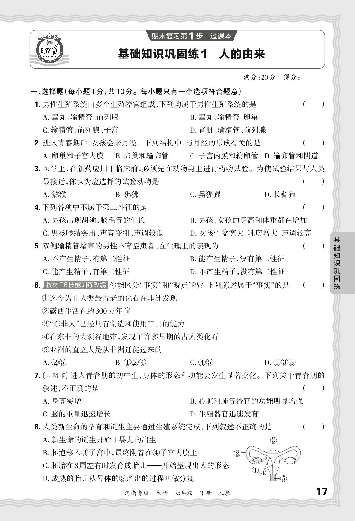 2024春下册七年级生物人教版 期末过课本河南版·基础知识巩固练 人的由来【1】