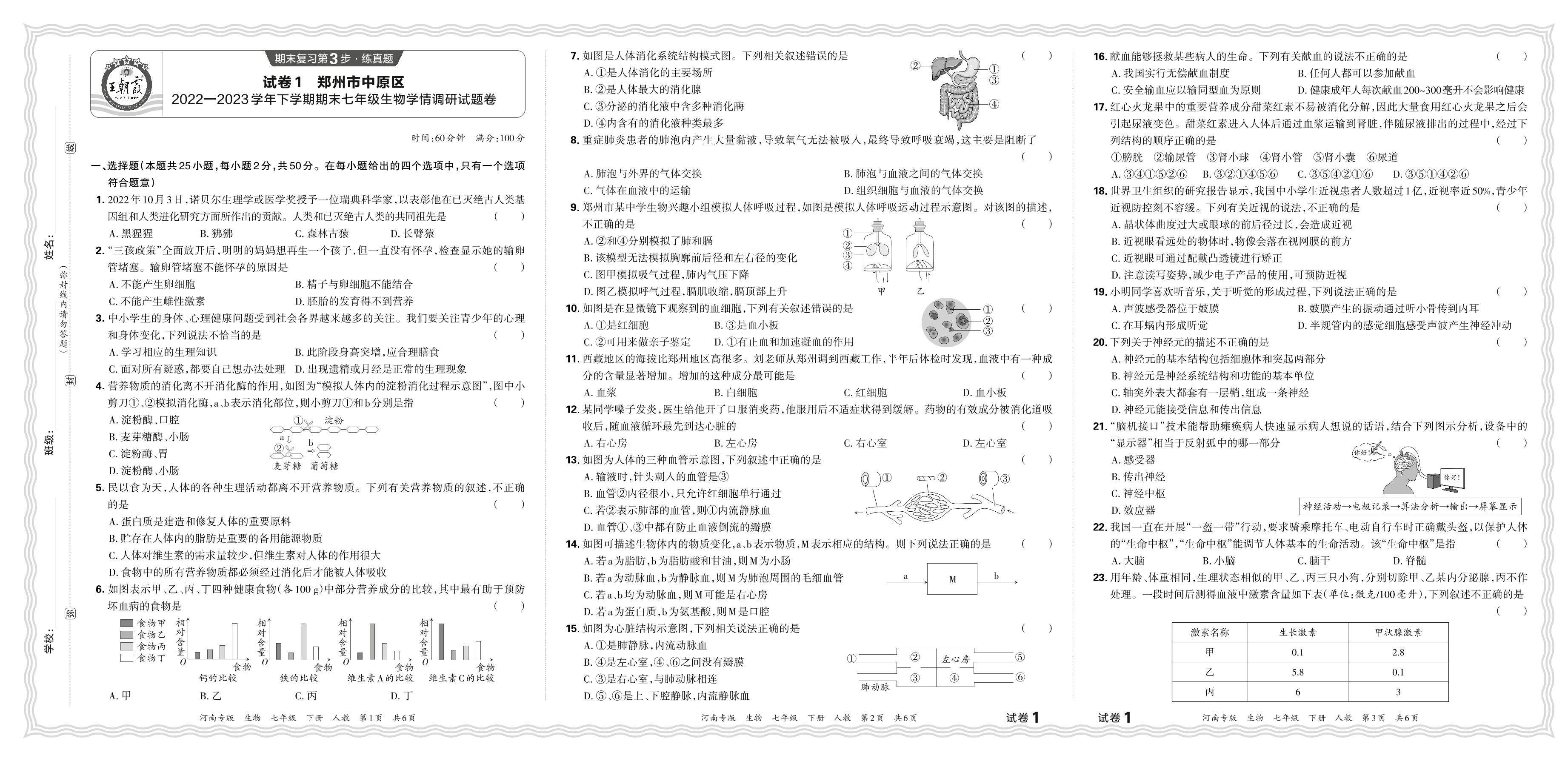 河南省郑州市中原区2022-2023学年下学期期末七年级生物学情调研试题卷(人教版)【1】