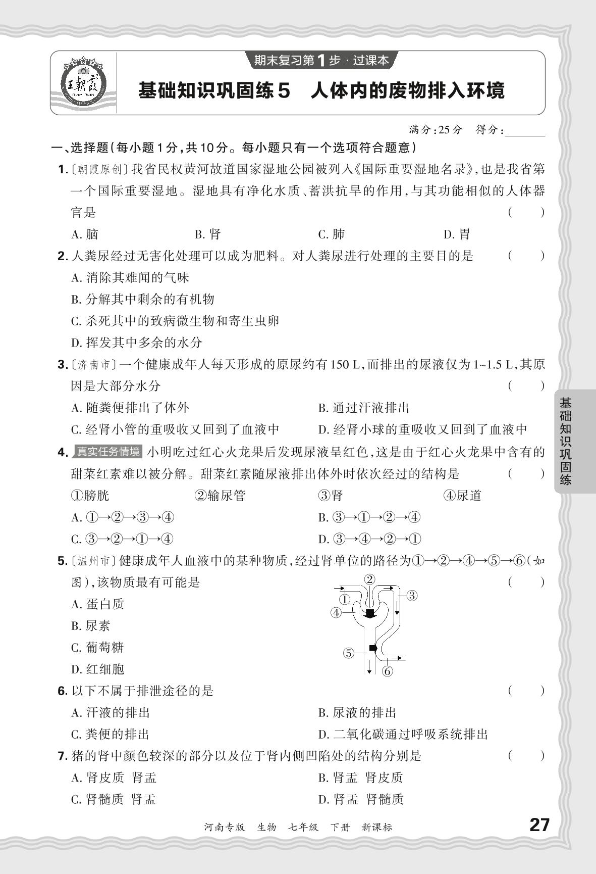 2024春下册七年级生物新课标版 期末过课本河南版·基础知识巩固练 人体内的废物排入环境【5】