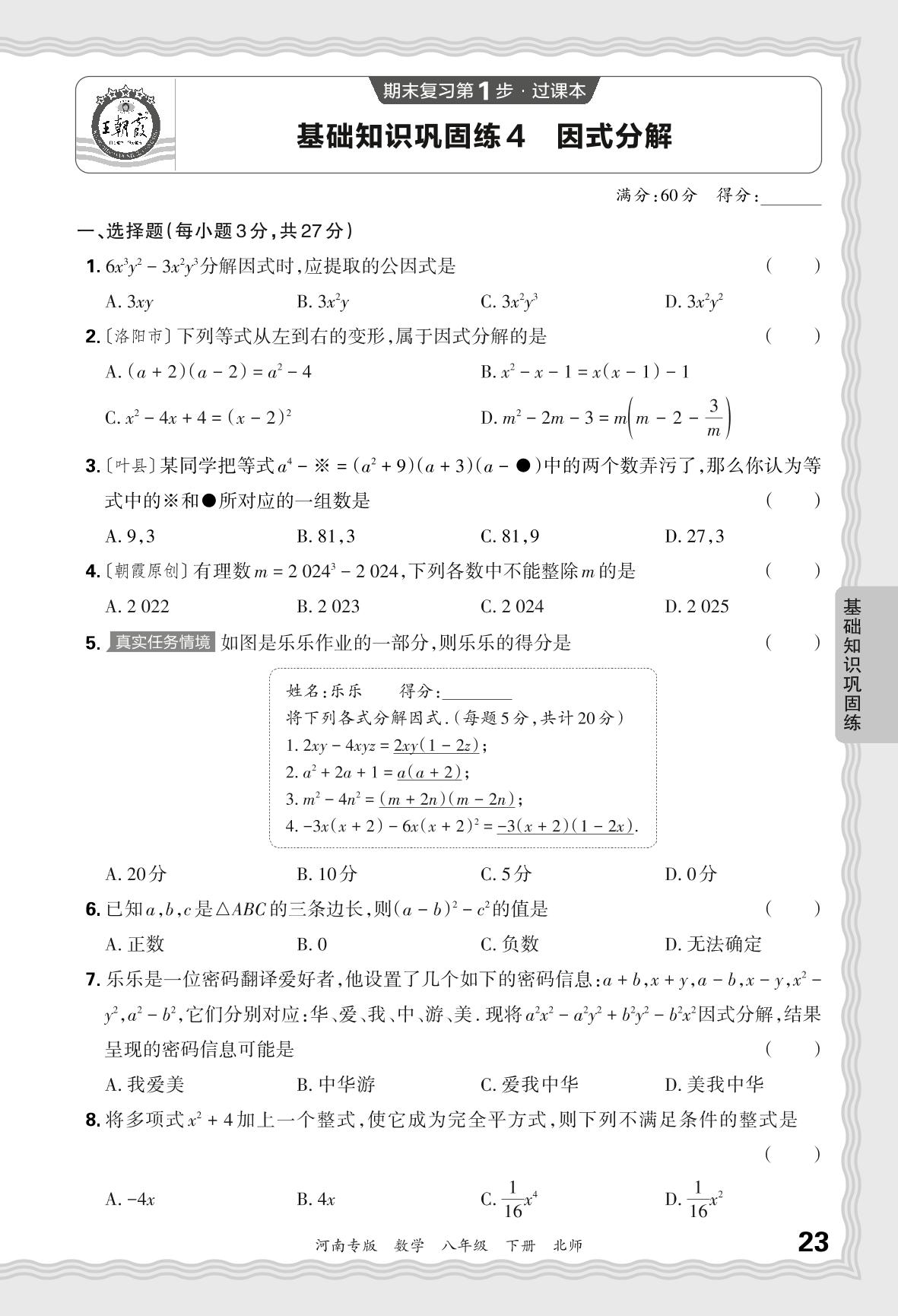 2024春下册八年级数学北师版 期末过课本河南版·基础知识巩固练 因式分解【4】
