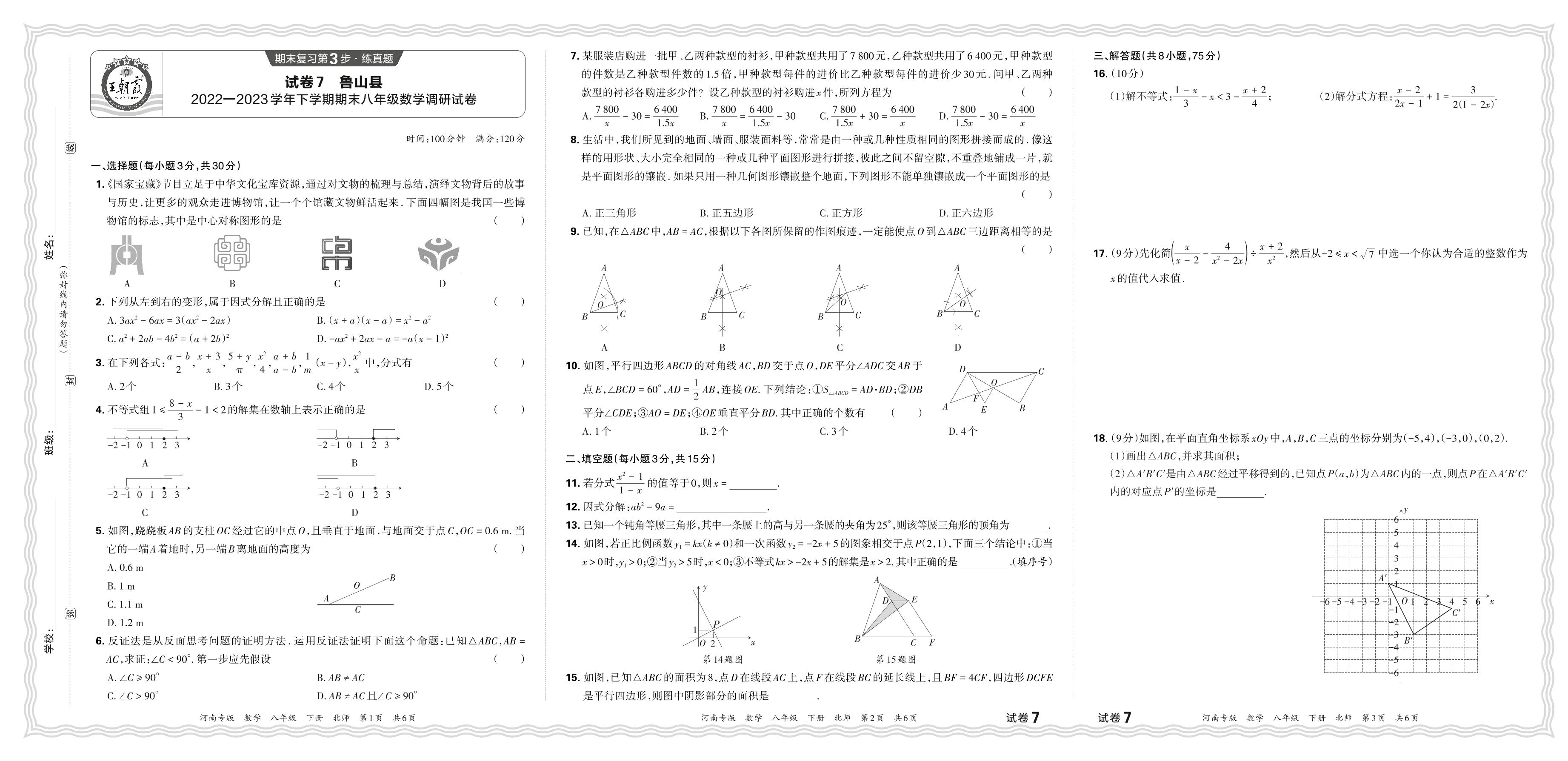 河南省鲁山县2022-2023学年下学期期末八年级数学调研试题(北师版)【7】