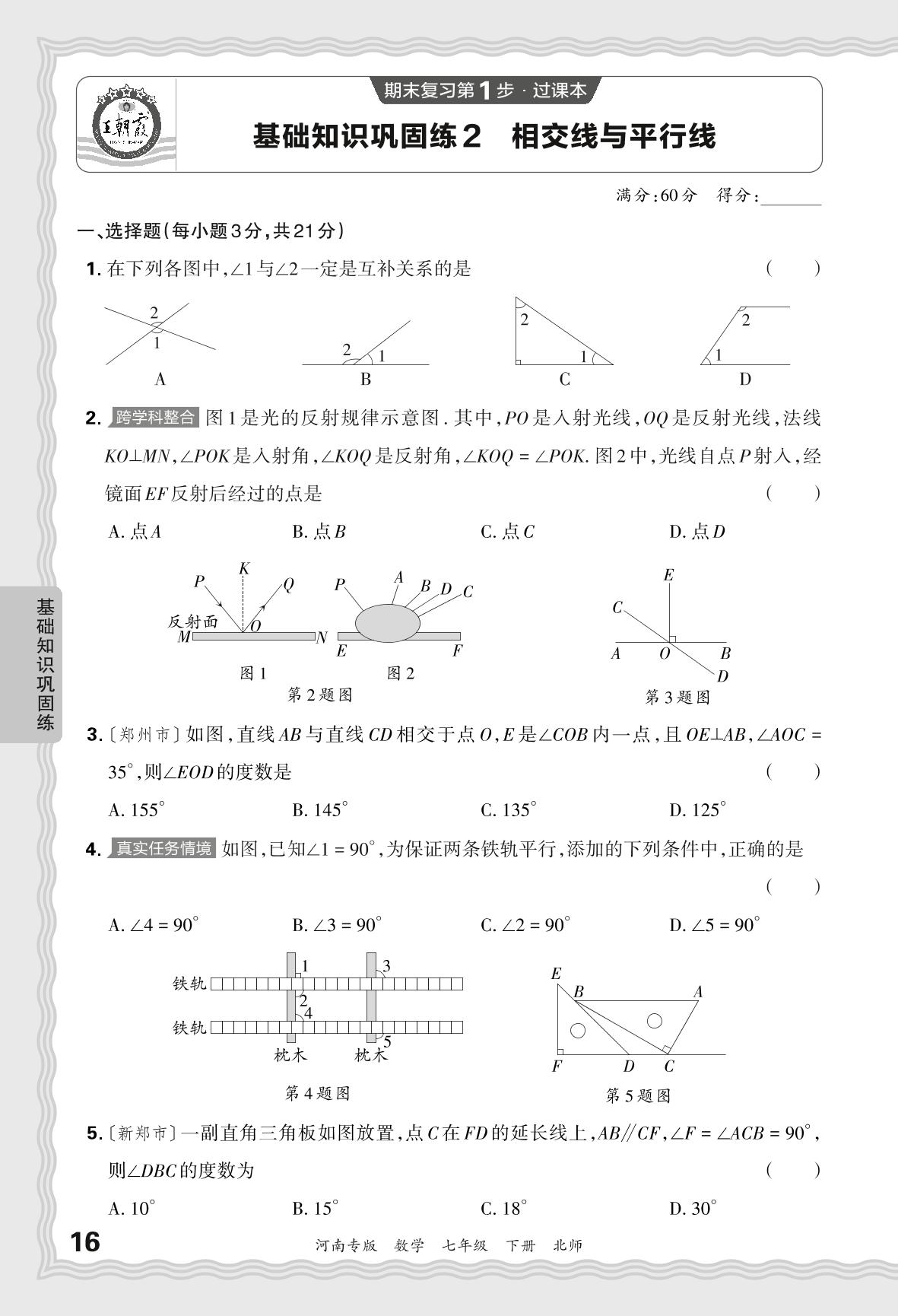 2024春下册七年级数学北师版 期末过课本河南版·基础知识巩固练 相交线与平行线【2】