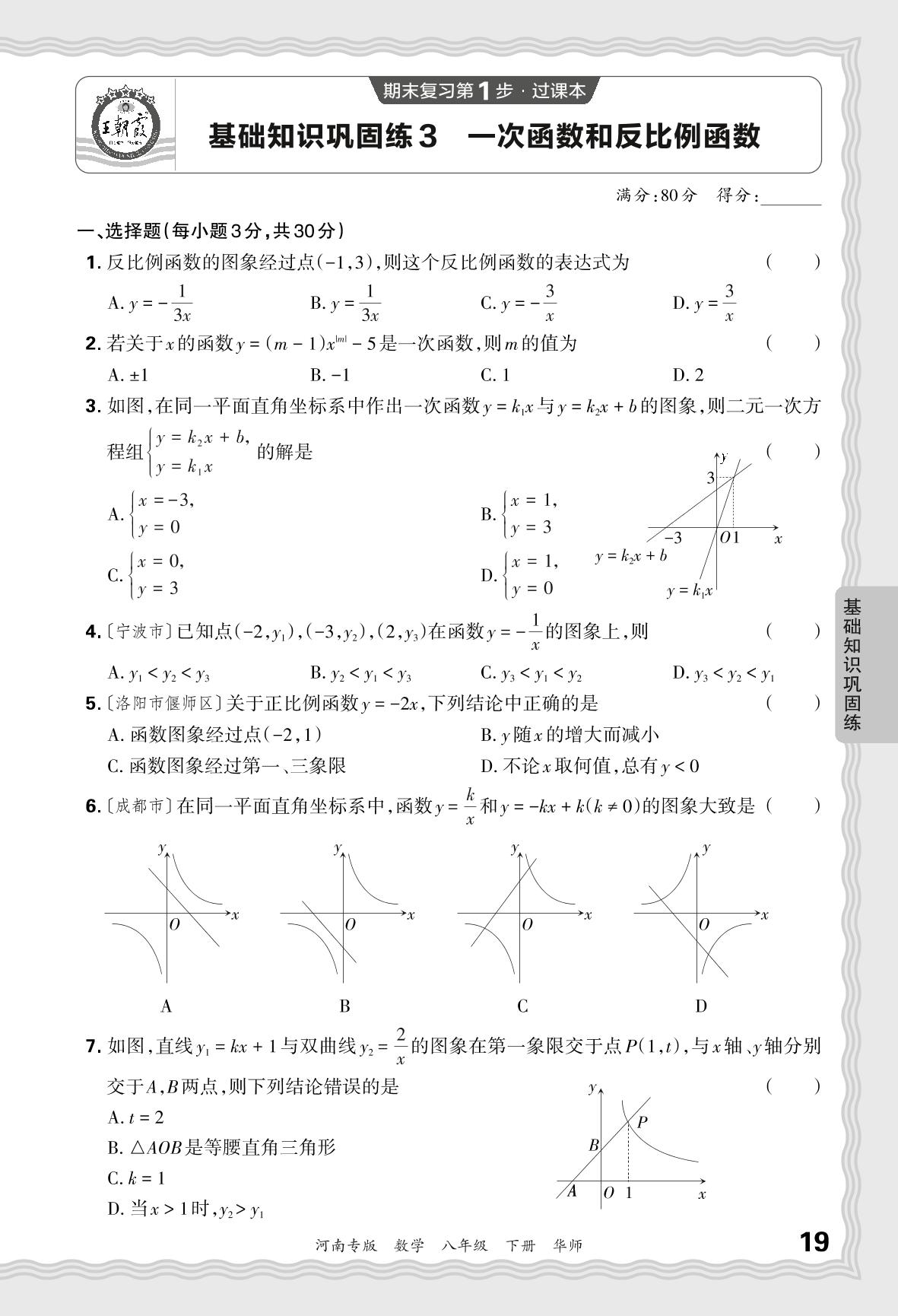 2024春下册八年级数学华师版 期末过课本河南版·基础知识巩固练 一次函数和反比例函数【3】