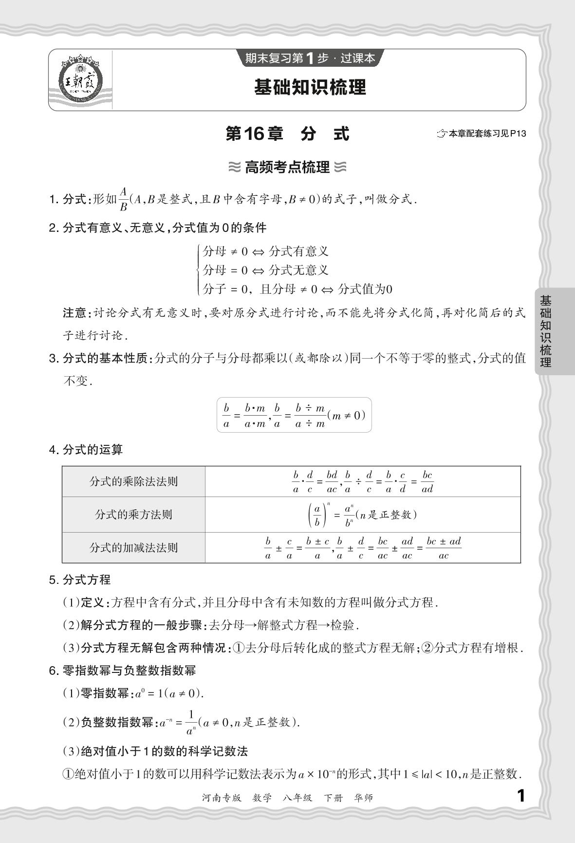 2024春下册八年级数学华师版 期末过课本河南版·基础知识梳理 第16章 分式